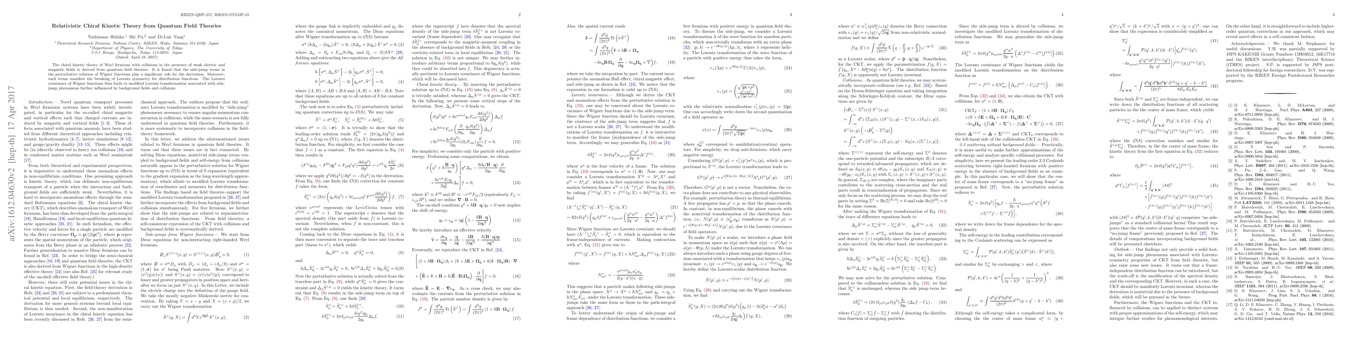 This paper derives relativistic chiral kinetic theory for Weyl fermions from quantum field theories, highlighting the importance of side-jump terms in Wigner functions that break Lorentz symmetry and modify the associated Lorentz transformations due to background fields and collisions.