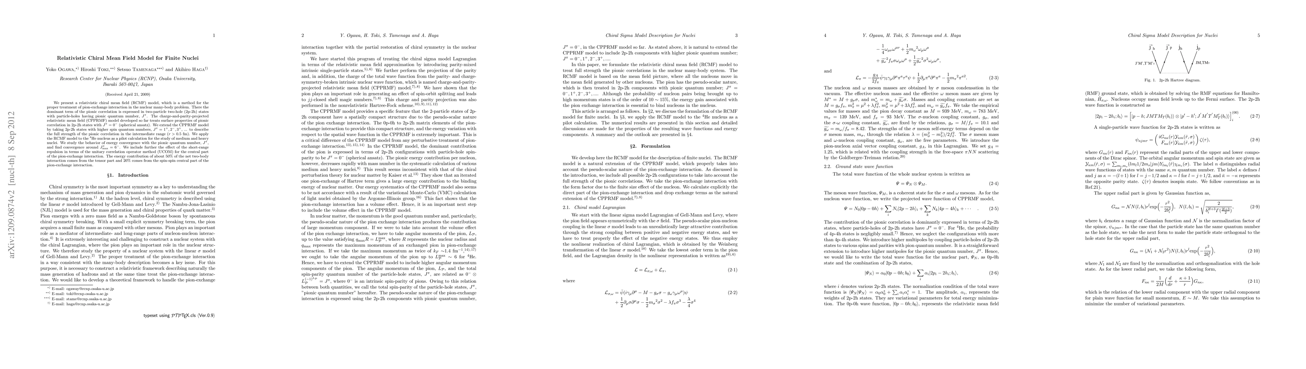 We present a relativistic chiral mean field (RCMF) model, which is a method for the proper treatment of pion-exchange interaction in the nuclear many-body problem. There the dominant term of the pionic correlation is expressed in two-particle two-hole (2p-2h) states with particle-holes having pionic quantum number, J^{pi}. The charge-and-parity-projected relativistic mean field (CPPRMF) model developed so far treats surface properties of pionic correlation in 2p-2h states with J^{pi} = 0^{-} (spherical ansatz). We extend the CPPRMF model by taking 2p-2h states with higher spin quantum numbers, J^{pi} = 1^{+}, 2^{-}, 3^{+}, ... to describe the full strength of the pionic correlation in the intermediate range (r > 0.5 fm). We apply the RCMF model to the ^{4}He nucleus as a pilot calculation for the study of medium and heavy nuclei. We study the behavior of energy convergence with the pionic quantum number, J^{pi}, and find convergence around J^{pi}_{max} = 6^{-}. We include further the effect of the short-range repulsion in terms of the unitary correlation operator method (UCOM) for the central part of the pion-exchange interaction. The energy contribution of about 50% of the net two-body interaction comes from the tensor part and 20% comes from the spin-spin central part of the pion-exchange interaction.