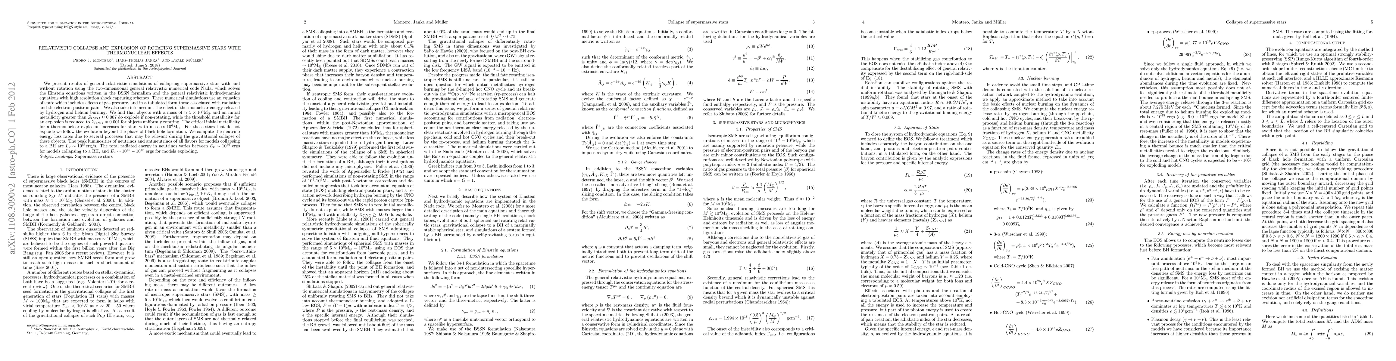 We present results of general relativistic simulations of collapsing supermassive stars with and without rotation using the two-dimensional general relativistic numerical code Nada, which solves the Einstein equations written in the BSSN formalism and the general relativistic hydrodynamics equations with high resolution shock capturing schemes. These numerical simulations use an equation of state which includes effects of gas pressure, and in a tabulated form those associated with radiation and the electron-positron pairs. We also take into account the effect of thermonuclear energy released by hydrogen and helium burning. We find that objects with a mass of 5x10^{5} solar mass and an initial metallicity greater than Z_{CNO}~0.007 do explode if non-rotating, while the threshold metallicity for an explosion is reduced to Z_{CNO}~0.001 for objects uniformly rotating. The critical initial metallicity for a thermonuclear explosion increases for stars with mass ~10^{6} solar mass. For those stars that do not explode we follow the evolution beyond the phase of black hole formation. We compute the neutrino energy loss rates due to several processes that may be relevant during the gravitational collapse of these objects. The peak luminosities of neutrinos and antineutrinos of all flavors for models collapsing to a BH are ~10^{55} erg/s. The total radiated energy in neutrinos varies between ~10^{56} ergs for models collapsing to a BH, and ~10^{45}-10^{46} ergs for models exploding.