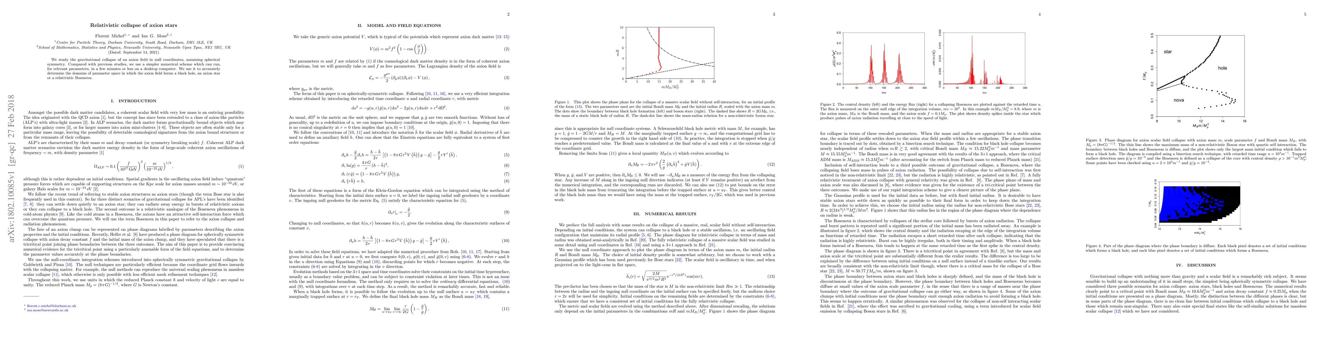 This paper investigates the gravitational collapse of an axion field using a simplified numerical method, determining which parameter regimes lead to black holes, axion stars, or relativistic Bosenovae. The new approach allows for rapid simulations, facilitating accurate domain mapping in parameter space.