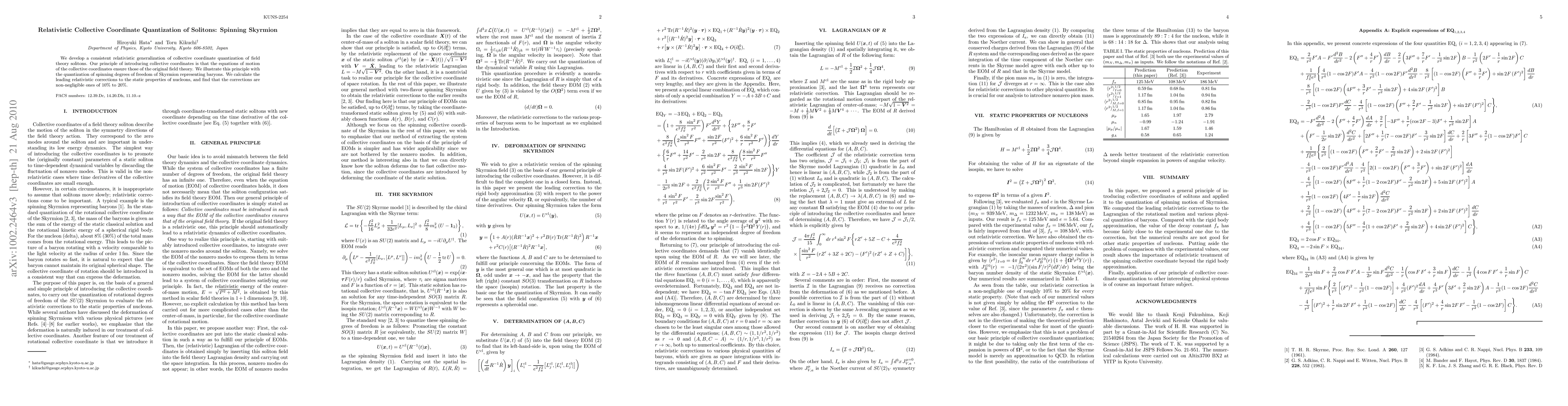 This paper presents a relativistic generalization of the collective coordinate quantization method for solitons, specifically applying it to the spinning Skyrmion model of baryons. The authors calculate leading relativistic corrections to the static properties of nucleons, finding significant corrections of 10% to 20%.