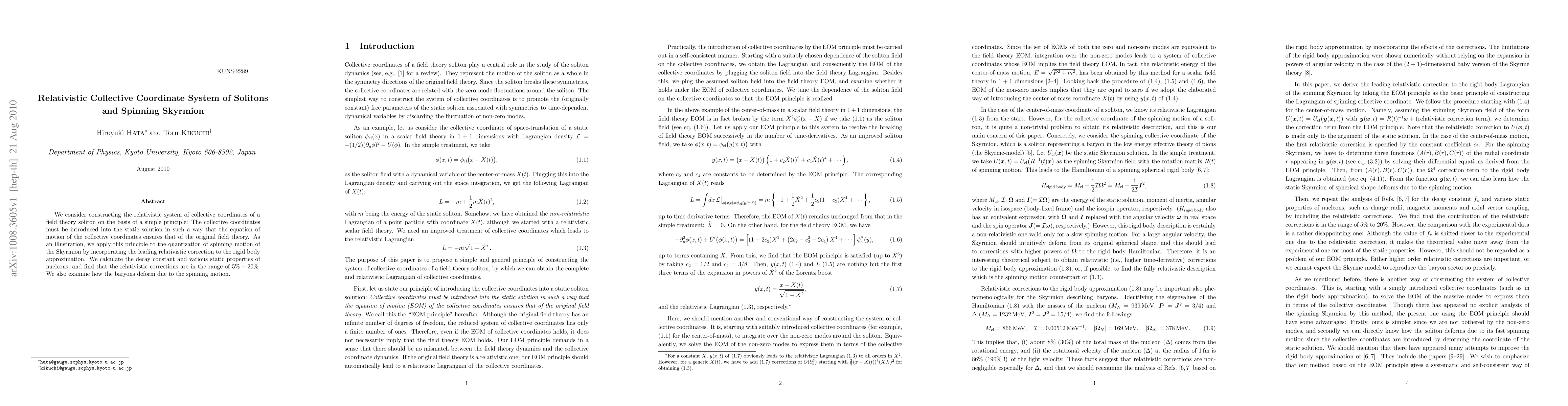 We consider constructing the relativistic system of collective coordinates of a field theory soliton on the basis of a simple principle: The collective coordinates must be introduced into the static solution in such a way that the equation of motion of the collective coordinates ensures that of the original field theory. As an illustration, we apply this principle to the quantization of spinning motion of the Skyrmion by incorporating the leading relativistic correction to the rigid body approximation. We calculate the decay constant and various static properties of nucleons, and find that the relativistic corrections are in the range of 5% -- 20%. We also examine how the baryons deform due to the spinning motion.