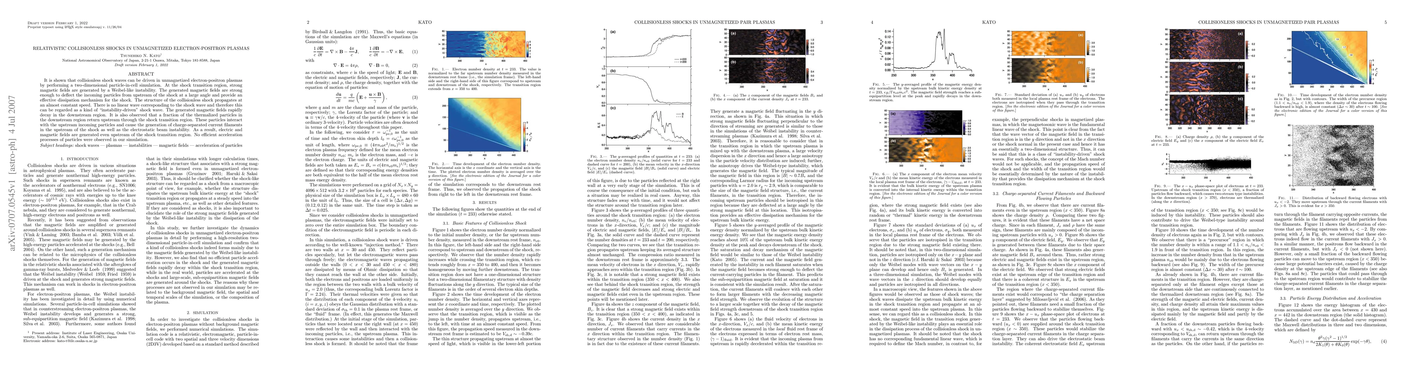 This paper demonstrates that collisionless shock waves can form in unmagnetized electron-positron plasmas via a Weibel-like instability, generating strong magnetic fields that provide shock dissipation. No efficient particle acceleration was observed, and thermalized particles return upstream, causing current filaments and electrostatic instabilities.