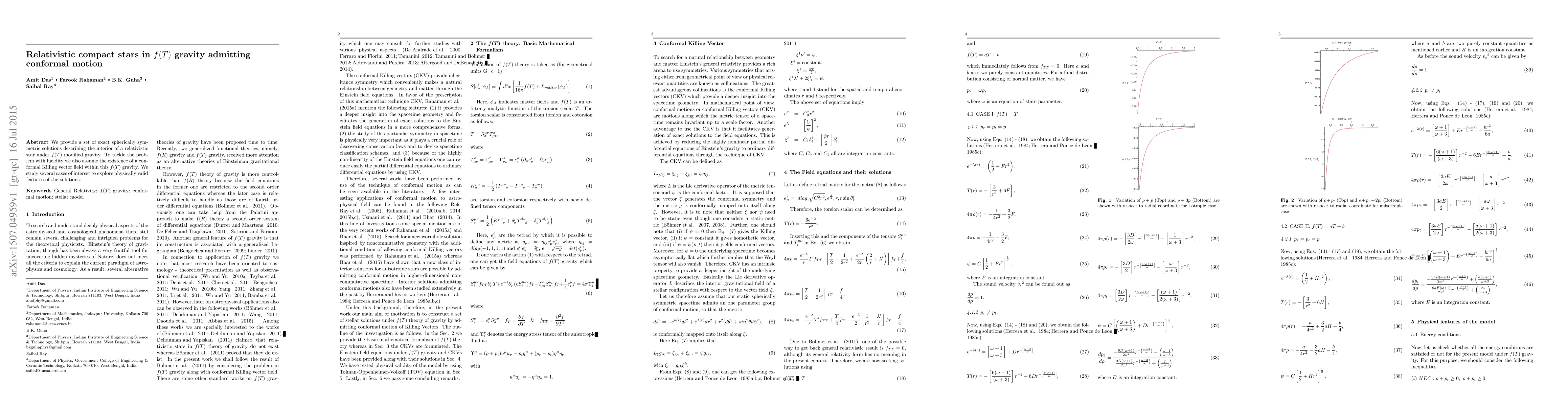 This paper presents exact spherically symmetric solutions for the interior of relativistic stars in f(T) modified gravity, assuming the presence of a conformal Killing vector field. It explores various cases to identify physically valid features of the solutions.