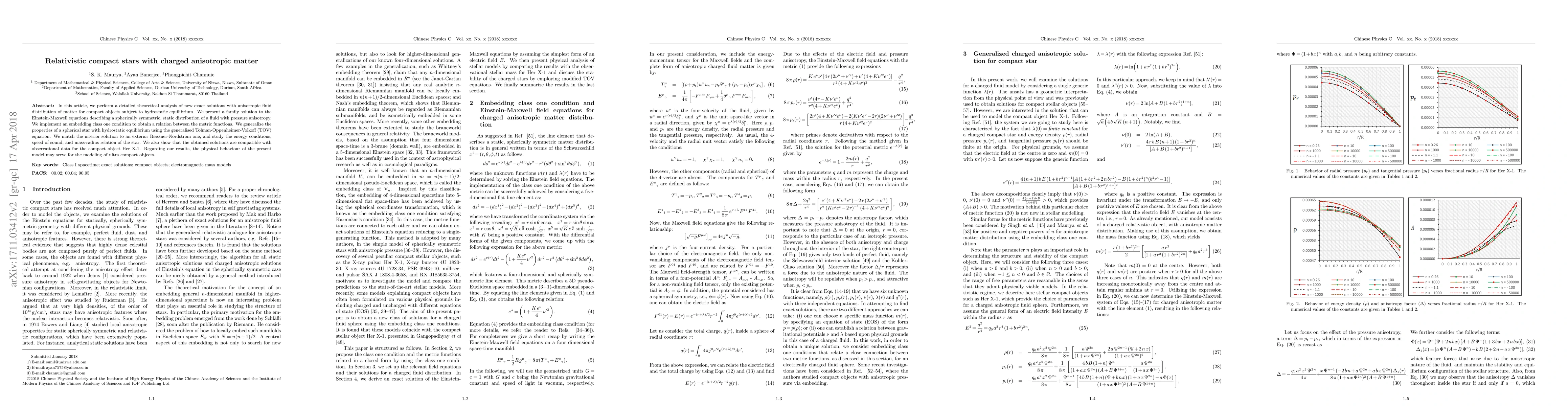 In this article we perform a detailed theoretical analysis for a class of new exact solutions with anisotropic fluid distribution of matter for compact objects in hydrostatic equilibrium. To achieve this we call the relation between the metric functions, namely, embedding class one condition. The investigation is carried out by generalising the properties of a spherical star with an emphasis on hydrostatic equilibrium equation, i.e., the generalised Tolman-Oppenheimer-Volkoff equation, in our understanding of these compact objects. We match the interior solution to an exterior Reissner-Nordstrom solution, and study some physical features of this models, such as the energy conditions, speeds of sound, and mass - radius relation of the star. We also show that obtained solution is compatible with observational data for compact object Her X-1.
