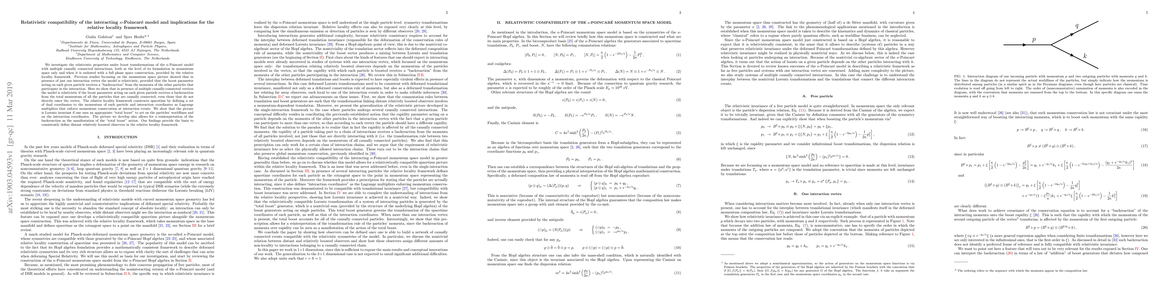 This paper examines the relativistic compatibility of the $\kappa$-Poincar\'e model with multiple causally connected interactions, showing that it remains relativistic under boost transformations when the total momentum of all causally connected particles is considered. The study supports the relative locality framework by demonstrating Lorentz invariance through an appropriate "total boost" and provides a foundation for defining distant relatively boosted observers.