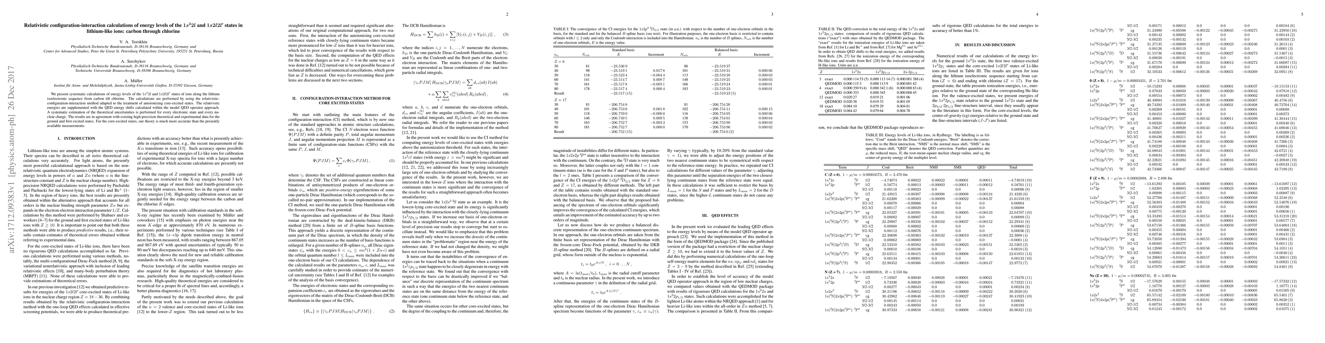We present systematic calculations of energy levels of the $1s^22l$ and $1s2l2l'$ states of ions along the lithium isoelectronic sequence from carbon till chlorine. The calculations are performed by using the relativistic-configuration-interaction method adapted to the treatment of autoionizing core-excited states. The relativistic energies are supplemented with the QED energy shifts calculated within the model QED operator approach. A systematic estimation of the theoretical uncertainties is performed for every electronic state and every nuclear charge. The results are in agreement with existing high-precision theoretical and experimental data for the ground and first excited states. For the core-excited states, our theory is much more accurate than the presently available measurements.