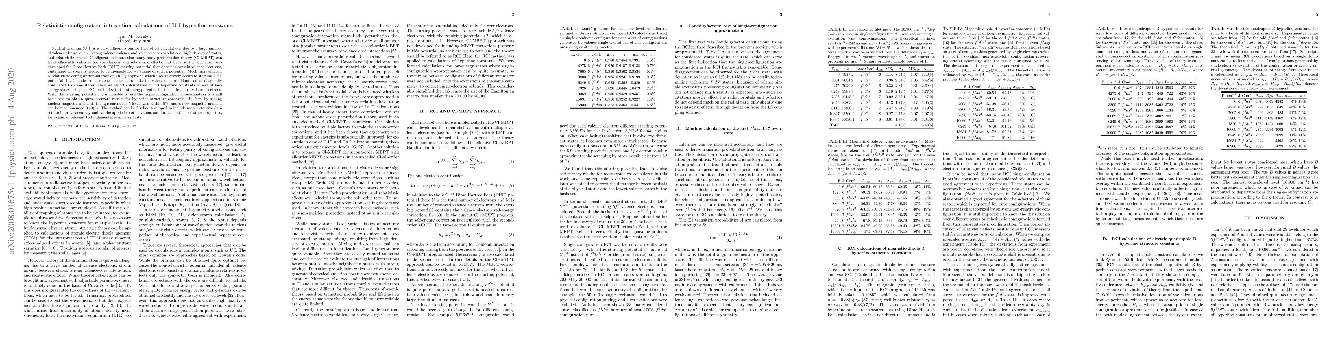 This paper reports relativistic configuration-interaction calculations for uranium (U I) hyperfine constants using the efficient RCI method, achieving good agreement within 5% for five levels and recommending a new nuclear magnetic moment of 0.43(2). The method can be extended for more extensive data and applied to other atoms for fundamental symmetry tests.