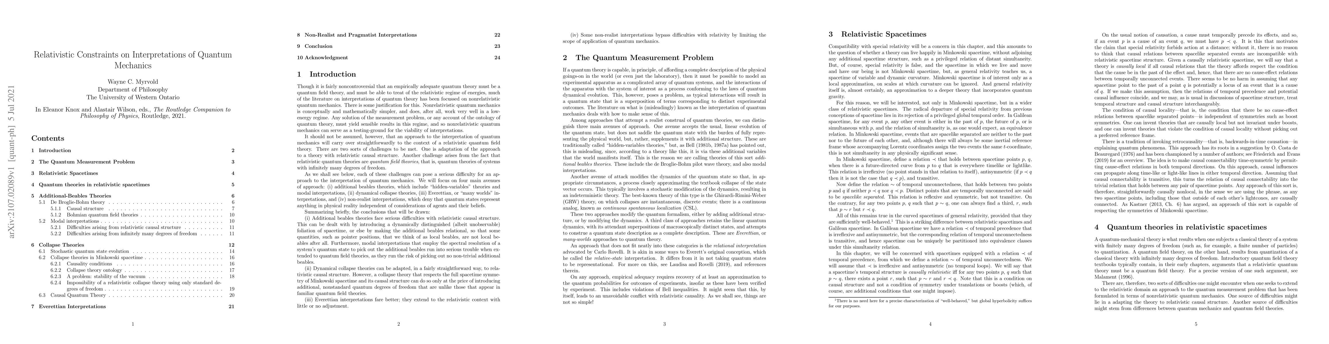 This paper explores how relativistic principles impose constraints on various interpretations of quantum mechanics, examining hidden-variables theories, dynamical collapse models, many-worlds interpretations, and non-realist views that reject independent physical reality of quantum states.