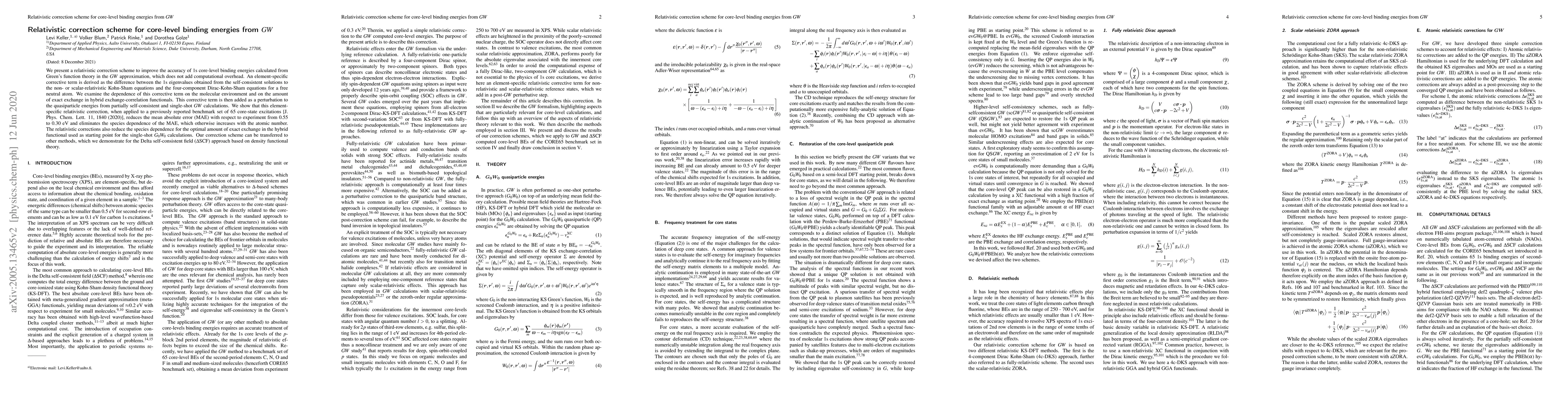 We present a relativistic correction scheme to improve the accuracy of 1s core-level binding energies calculated from Green's function theory in the $GW$ approximation, which does not add computational overhead. An element-specific corrective term is derived as the difference between the 1s eigenvalues obtained from the self-consistent solutions to the non- or scalar-relativistic Kohn-Sham equations and the four-component Dirac-Kohn-Sham equations for a free neutral atom. We examine the dependence of this corrective term on the molecular environment and on the amount of exact exchange in hybrid exchange-correlation functionals. This corrective term is then added as a perturbation to the quasiparticle energies from partially self-consistent and single-shot $GW$ calculations. We show that this element-specific relativistic correction, when applied to a previously reported benchmark set of 65 core-state excitations [J. Phys. Chem. Lett. 11, 1840 (2020)], reduces the mean absolute error (MAE) with respect to experiment from 0.55 to 0.30 eV and eliminates the species dependence of the MAE, which otherwise increases with the atomic number. The relativistic corrections also reduce the species dependence for the optimal amount of exact exchange in the hybrid functional used as starting point for the single-shot $G_0W_0$ calculations. Our correction scheme can be transferred to other methods, which we demonstrate for the Delta self-consistent field ($\Delta$SCF) approach based on density functional theory.