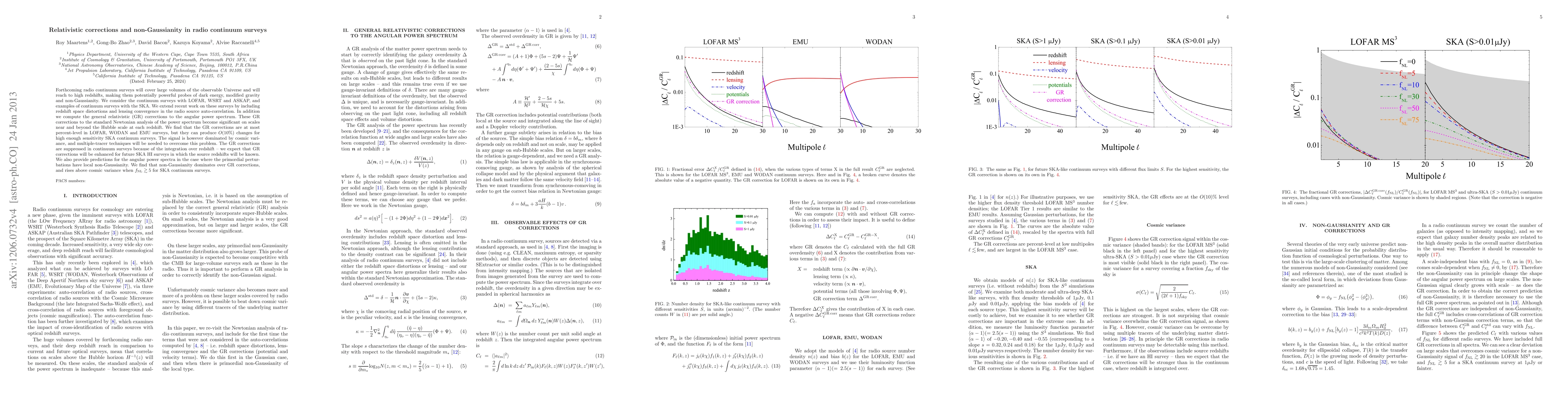This paper investigates relativistic corrections and non-Gaussianity in upcoming radio continuum surveys, finding that general relativistic corrections can significantly alter the angular power spectrum, especially for high-sensitivity surveys like SKA. Non-Gaussianity effects are shown to dominate over relativistic corrections when the non-Gaussian parameter exceeds 5.