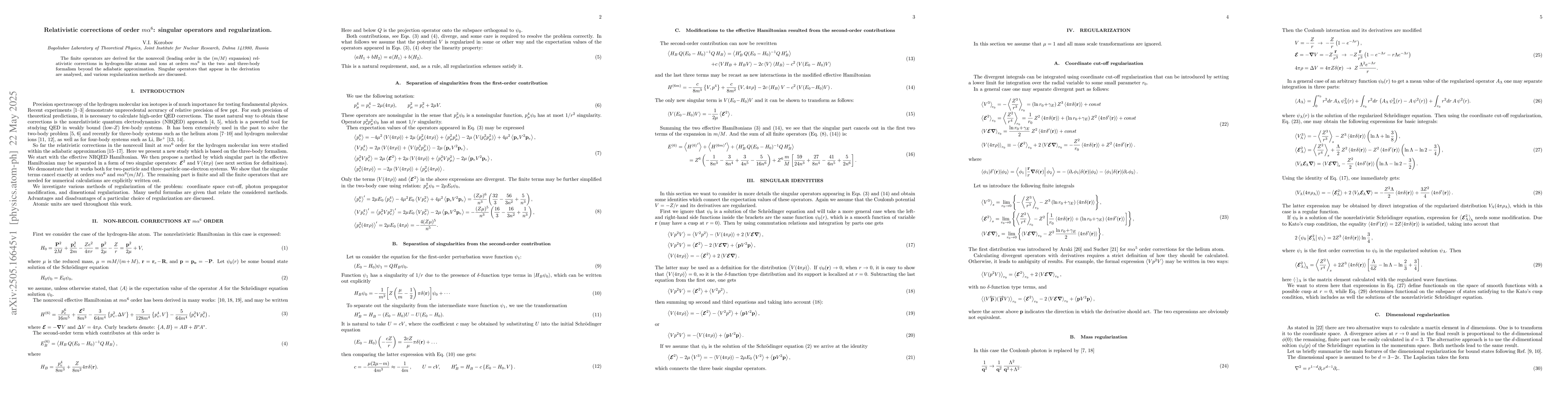 This work presents an in-depth analysis of singular operators and regularization techniques, providing a comprehensive treatment of nonrecoil relativistic corrections beyond the adiabatic approximation.