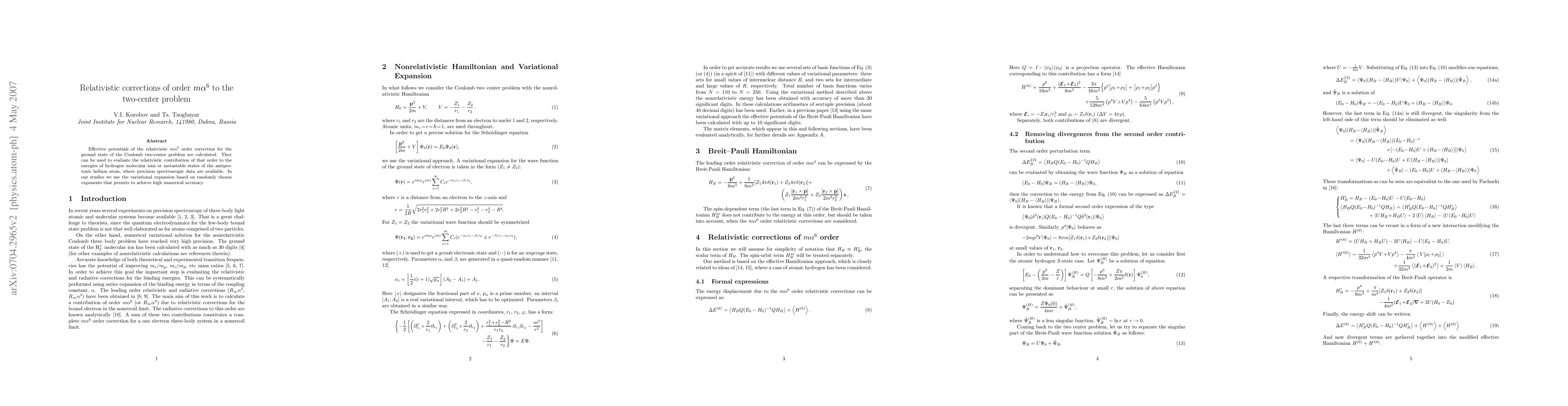 Effective potentials of the relativistic m\alpha^6 order correction for the ground state of the Coulomb two-center problem are calculated. They can be used to evaluate the relativistic contribution of that order to the energies of hydrogen molecular ions or metastable states of the antiprotonic helium atom, where precision spectroscopic data are available. In our studies we use the variational expansion based on randomly chosen exponents that permits to achieve high numerical accuracy.