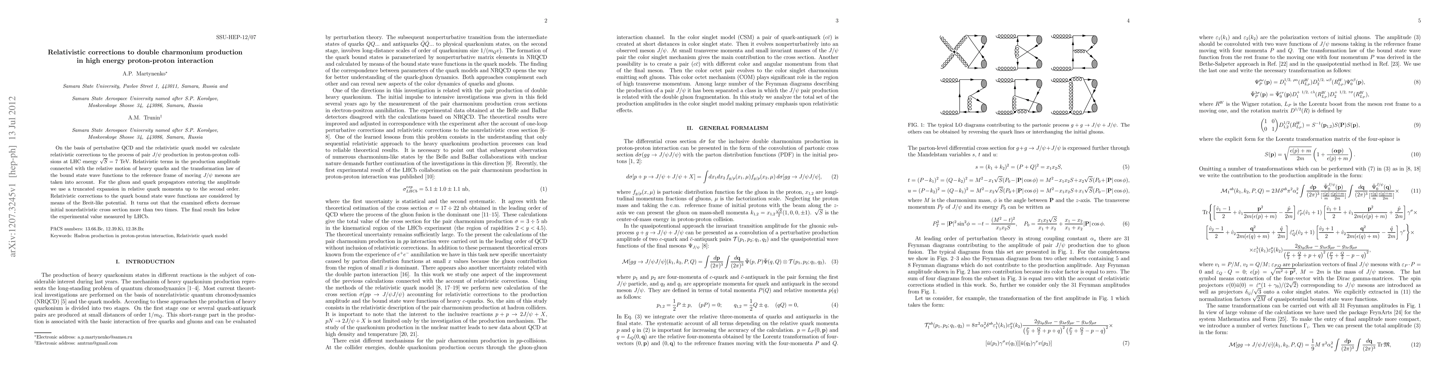 On the basis of pertubative QCD and the relativistic quark model we calculate relativistic corrections to the process of pair $J/\psi$ production in proton-proton collisions at LHC energy $\sqrt S=7$ TeV. Relativistic terms in the production amplitude connected with the relative motion of heavy quarks and the transformation law of the bound state wave functions to the reference frame of moving $J/\psi$ mesons are taken into account. For the gluon and quark propagators entering the amplitude we use a truncated expansion in relative quark momenta up to the second order. Relativistic corrections to the quark bound state wave functions are considered by means of the Breit-like potential. It turns out that the examined effects decrease initial nonrelativistic cross section more than two times. The final result lies below the experimental value measured by LHCb.