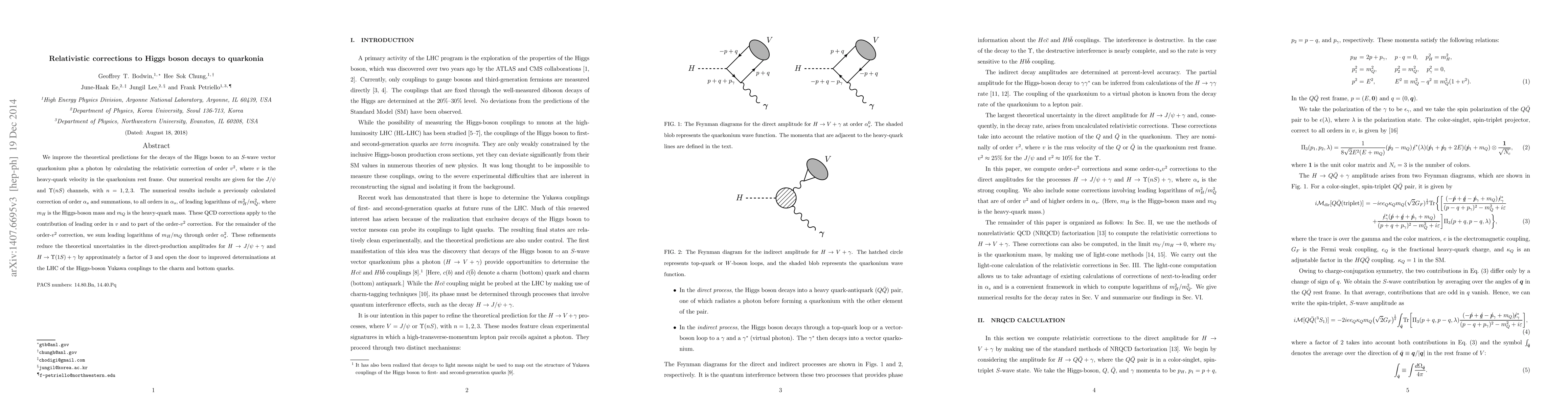 We improve the theoretical predictions for the decays of the Higgs boson to an $S$-wave vector quarkonium plus a photon by calculating the relativistic correction of order $v^2$, where $v$ is the heavy-quark velocity in the quarkonium rest frame. Our numerical results are given for the $J/\psi$ and $\Upsilon(nS)$ channels, with $n=1,2,3$. The numerical results include a previously calculated correction of order $\alpha_s$ and summations, to all orders in $\alpha_s$, of leading logarithms of $m_H^2/m_Q^2$, where $m_H$ is the Higgs-boson mass and $m_Q$ is the heavy-quark mass. These QCD corrections apply to the contribution of leading order in $v$ and to part of the order-$v^2$ correction. For the remainder of the order-$v^2$ correction, we sum leading logarithms of $m_H/m_Q$ through order $\alpha_s^2$. These refinements reduce the theoretical uncertainties in the direct-production amplitudes for $H \to J/\psi+\gamma$ and $H \to \Upsilon(1S)+\gamma$ by approximately a factor of 3 and open the door to improved determinations at the LHC of the Higgs-boson Yukawa couplings to the charm and bottom quarks.