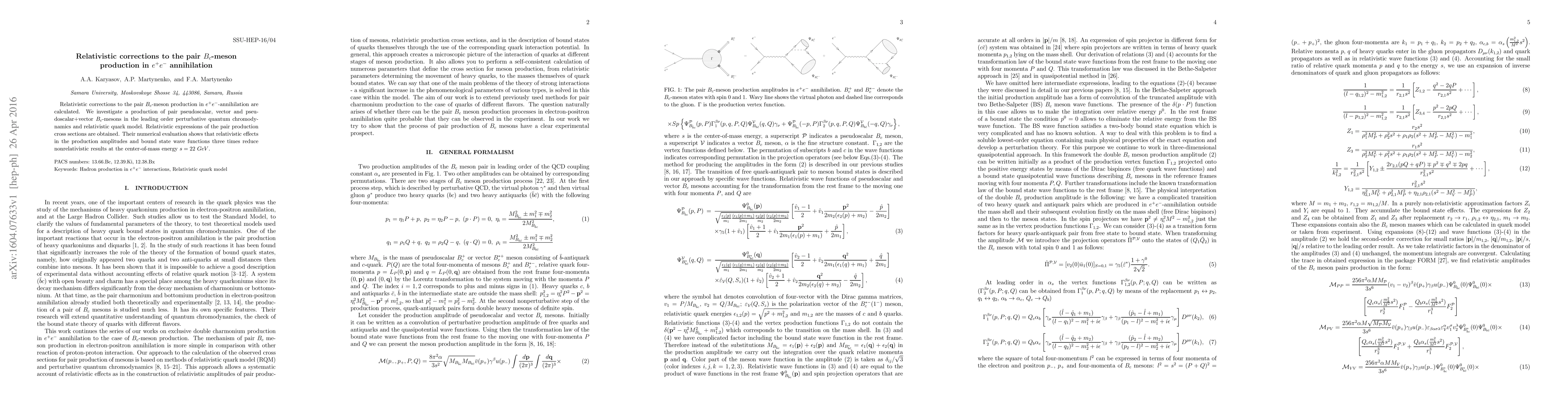 This paper calculates relativistic corrections for the production of $B_c$-meson pairs in $e^+e^-$ annihilation, employing leading order perturbative QCD and the relativistic quark model. The results show that relativistic effects reduce nonrelativistic predictions by a factor of three at a center-of-mass energy of 22 GeV.