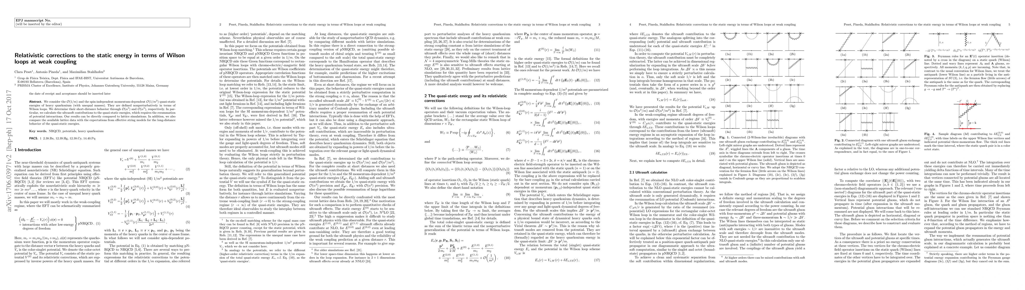 We consider the ${\mathcal O}(1/m)$ and the spin-independent momentum-dependent ${\mathcal O}(1/m^2)$ quasi-static energies of heavy quarkonium (with unequal masses). They are defined nonperturbatively in terms of Wilson loops. We determine their short-distance behavior through ${\mathcal O}(\alpha^3)$ and ${\mathcal O}(\alpha^2)$, respectively. In particular, we calculate the ultrasoft contributions to the quasi-static energies, which requires the resummation of potential interactions. Our results can be directly compared to lattice simulations. In addition, we also compare the available lattice data with the expectations from effective string models for the long-distance behavior of the quasi-static energies.