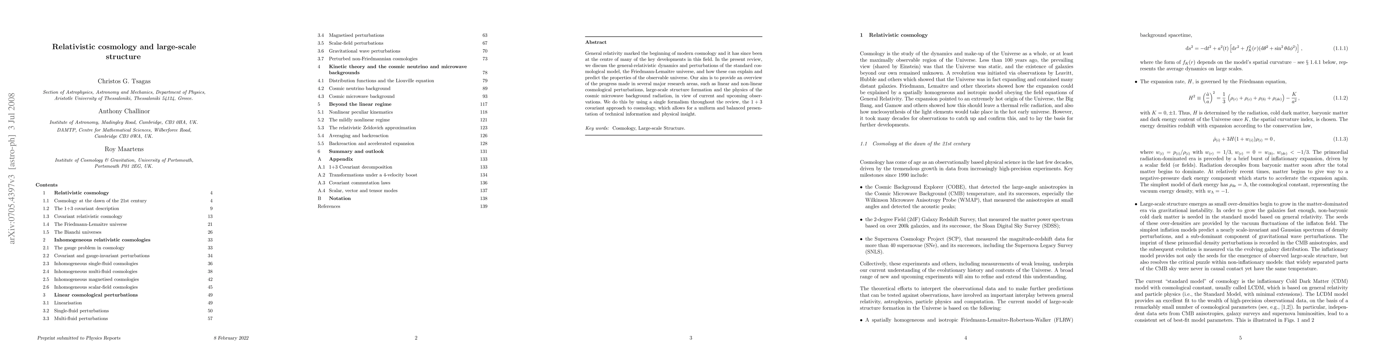 The review discusses the general-relativistic dynamics and perturbations of the Friedmann-Lemaitre universe using a single formalism, the 1+3 covariant approach to cosmology.