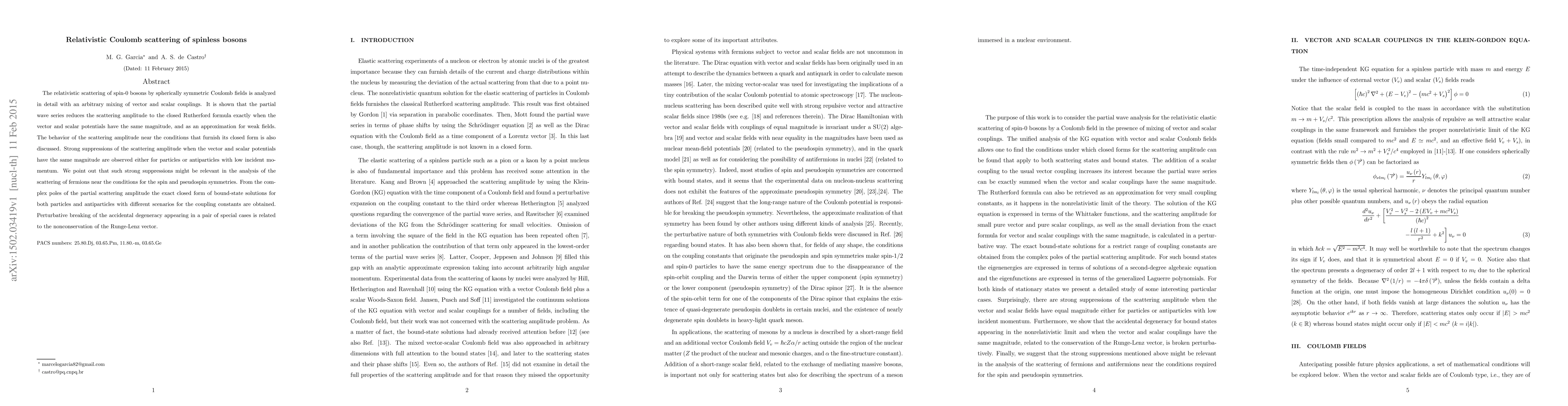 This paper analyzes the relativistic scattering of spin-0 bosons by Coulomb fields, revealing that the scattering amplitude follows the Rutherford formula when vector and scalar potentials are equal in magnitude. It also discusses strong suppressions in scattering amplitudes for low momentum particles/antiparticles and the relevance to fermion scattering, as well as the derivation of exact bound-state solutions from complex poles in scattering amplitudes.