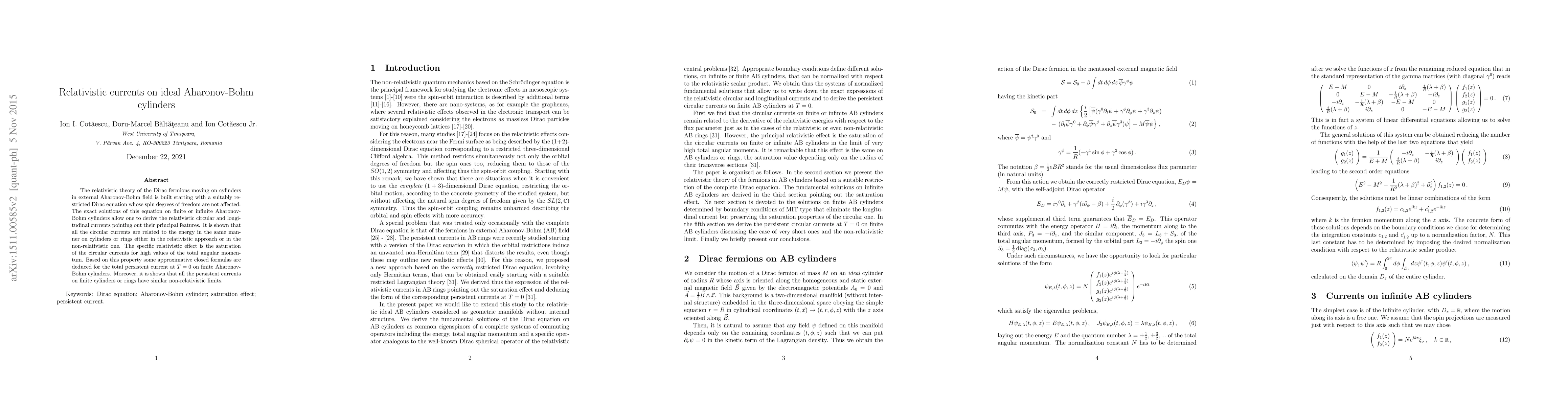 This paper constructs a relativistic theory for Dirac fermions on Aharonov-Bohm cylinders, deriving exact solutions that reveal the behavior of relativistic circular and longitudinal currents. It highlights the saturation of circular currents at high angular momentum and provides approximate formulas for persistent current at zero temperature.