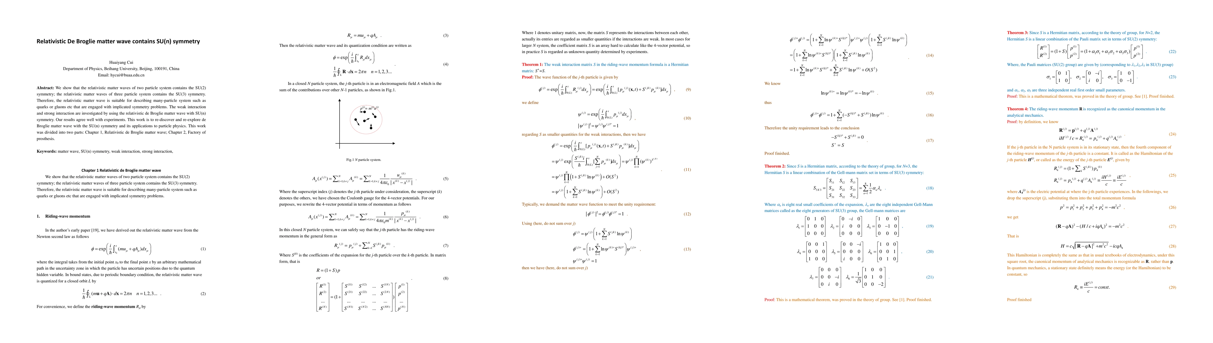 We show that the relativistic matter waves of two particle system contains the SU(2) symmetry; the relativistic matter waves of three particle system contains the SU(3) symmetry. Therefore, the relativistic matter wave is suitable for describing many-particle system such as quarks or gluons etc that are engaged with implicated symmetry problems. The weak interaction and strong interaction are investigated by using the relativistic de Broglie matter wave with SU(n) symmetry. Our results agree well with experiments. This work is to re-discover and re-explore de Broglie matter wave with the SU(n) symmetry and its applications to particle physics. This work was divided into two parts: Chapter 1, Relativistic de Broglie matter wave; Chapter 2, Factory of prosthesis.