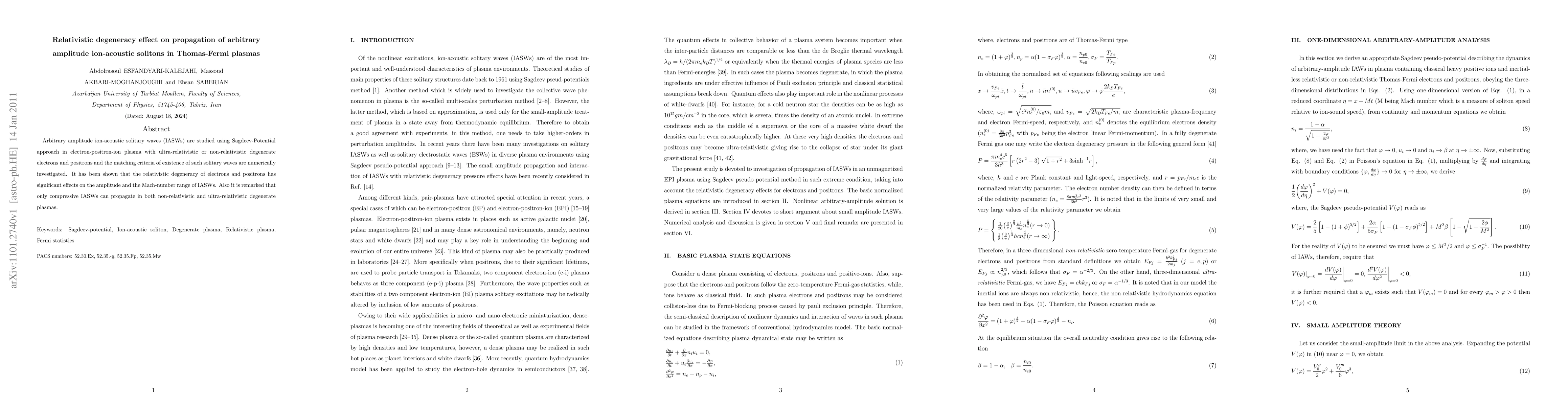 This paper investigates the impact of relativistic degeneracy on the propagation of arbitrary amplitude ion-acoustic solitary waves in Thomas-Fermi plasmas using the Sagdeev-Potential approach. It finds that relativistic degeneracy significantly affects the wave's amplitude and the Mach-number range, with only compressive waves able to propagate in both non-relativistic and ultra-relativistic degenerate plasmas.