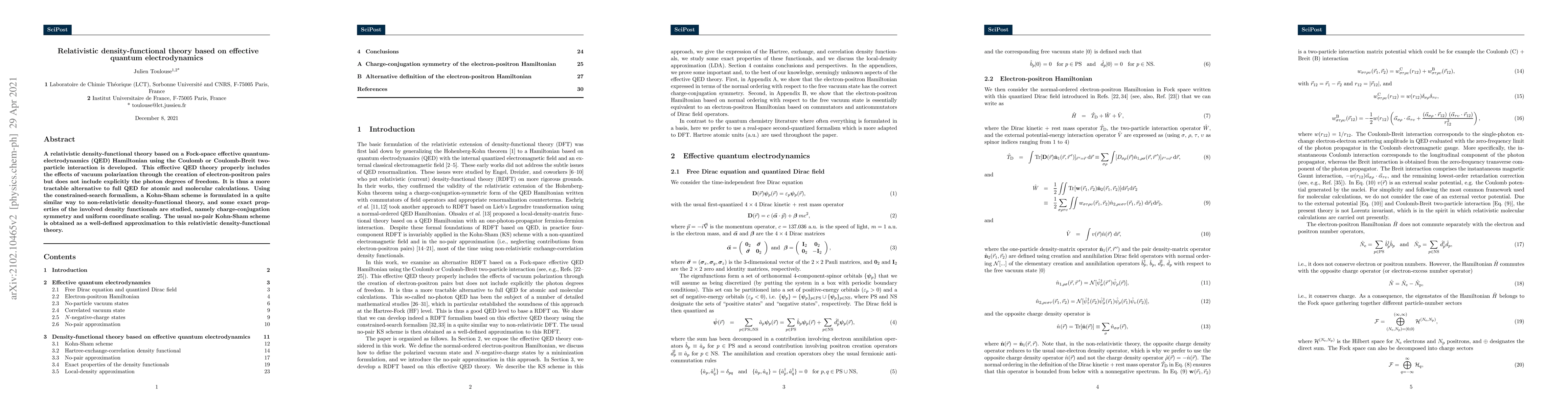 This paper develops a relativistic density-functional theory based on effective quantum electrodynamics, using a Fock-space Hamiltonian that includes vacuum polarization effects without explicitly considering photon degrees of freedom. The Kohn-Sham scheme is formulated similarly to non-relativistic density-functional theory, and properties like charge-conjugation symmetry and uniform coordinate scaling are studied.