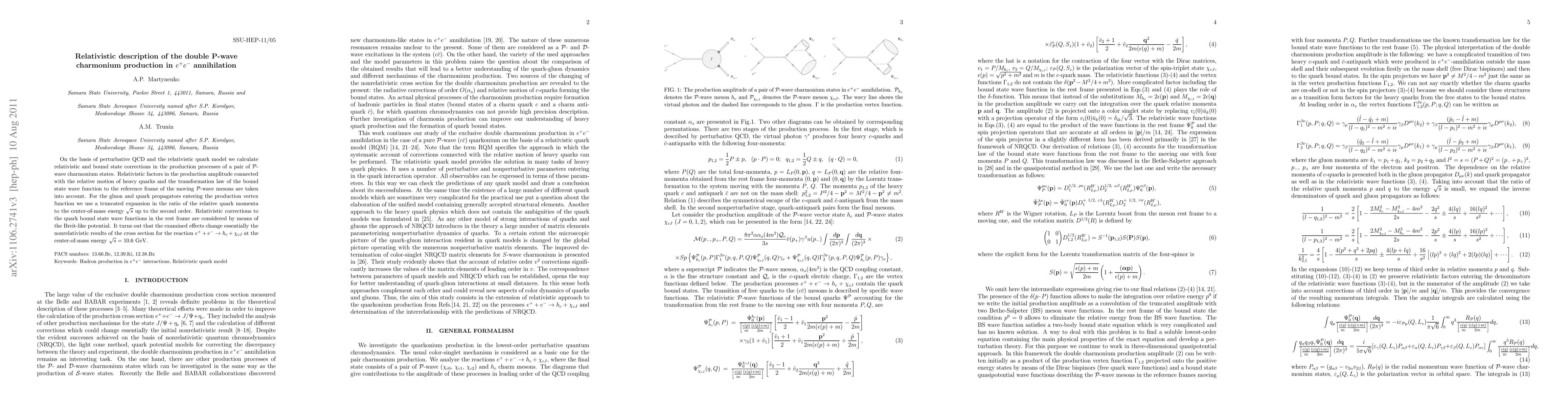 On the basis of perturbative QCD and the relativistic quark model we calculate relativistic and bound state corrections in the production processes of a pair of P-wave charmonium states. Relativistic factors in the production amplitude connected with the relative motion of heavy quarks and the transformation law of the bound state wave function to the reference frame of the moving P-wave mesons are taken into account. For the gluon and quark propagators entering the production vertex function we use a truncated expansion in the ratio of the relative quark momenta to the center-of-mass energy sqrt{s} up to the second order. Relativistic corrections to the quark bound state wave functions in the rest frame are considered by means of the Breit-like potential. It turns out that the examined effects change essentially the nonrelativistic results of the cross section for the reaction e^++e^-\to h_c+\chi_{cJ} at the center-of-mass energy sqrt{s}=10.6 GeV.