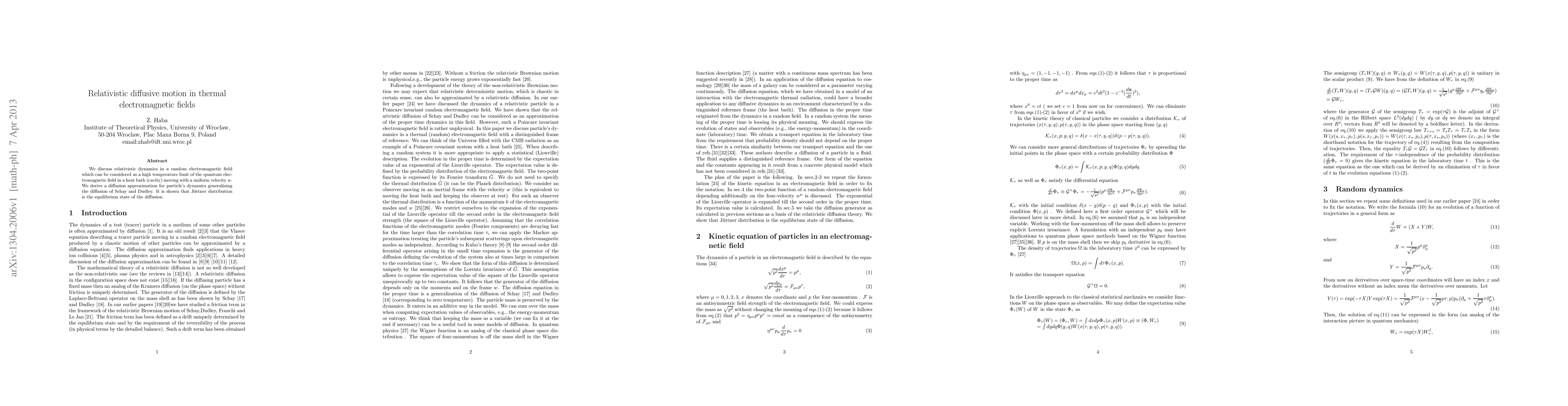 This paper derives a relativistic diffusion approximation for particle dynamics in a high-temperature thermal electromagnetic field, generalizing previous models. The Juttner distribution is identified as the equilibrium state of this relativistic diffusive motion.