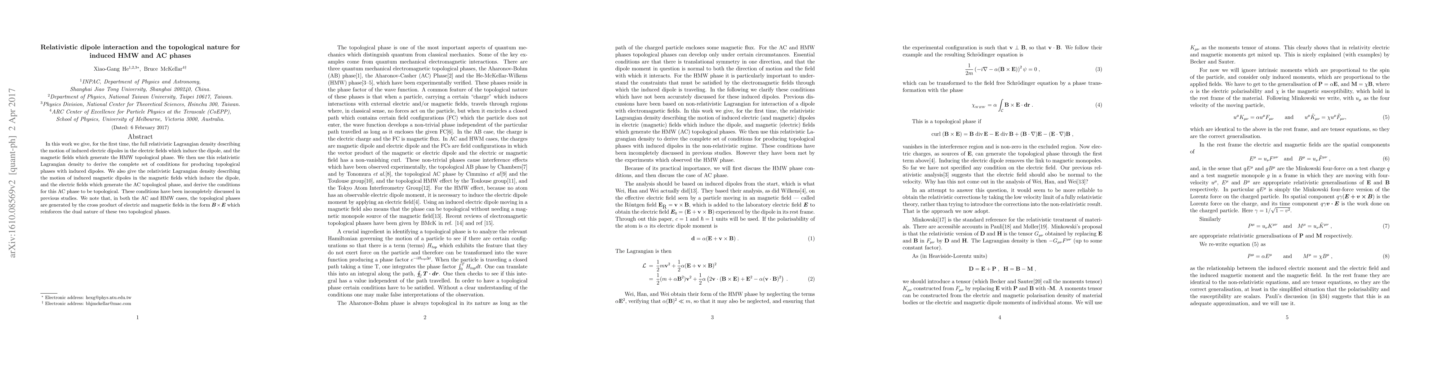 This paper presents the first relativistic Lagrangian density for induced electric and magnetic dipoles, deriving conditions for the topological HMW and AC phases generated by the cross product of electric and magnetic fields. It addresses previously incompletely discussed conditions for these topological phases.