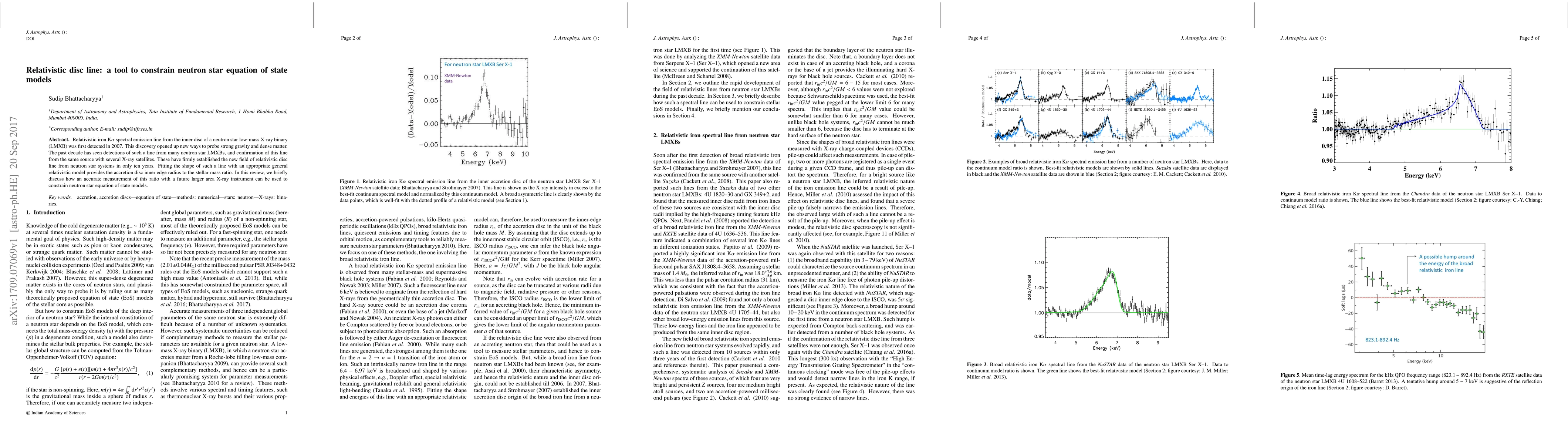 Relativistic iron K$\alpha$ spectral emission line from the inner disc of a neutron star low-mass X-ray binary (LMXB) was first detected in 2007. This discovery opened up new ways to probe strong gravity and dense matter. The past decade has seen detections of such a line from many neutron star LMXBs, and confirmation of this line from the same source with several X-ray satellites. These have firmly established the new field of relativistic disc line from neutron star systems in only ten years. Fitting the shape of such a line with an appropriate general relativistic model provides the accretion disc inner edge radius to the stellar mass ratio. In this review, we briefly discuss how an accurate measurement of this ratio with a future larger area X-ray instrument can be used to constrain neutron star equation of state models.