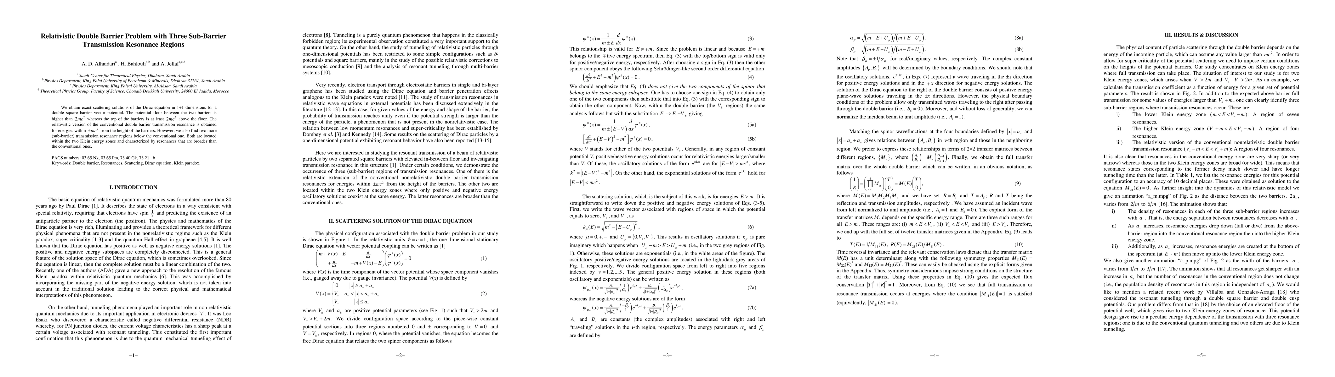 This paper presents exact scattering solutions for the Dirac equation in 1+1 dimensions for a double square barrier potential, revealing three distinct transmission resonance regions, including two sub-barrier regions characterized by broader resonances than the conventional one.