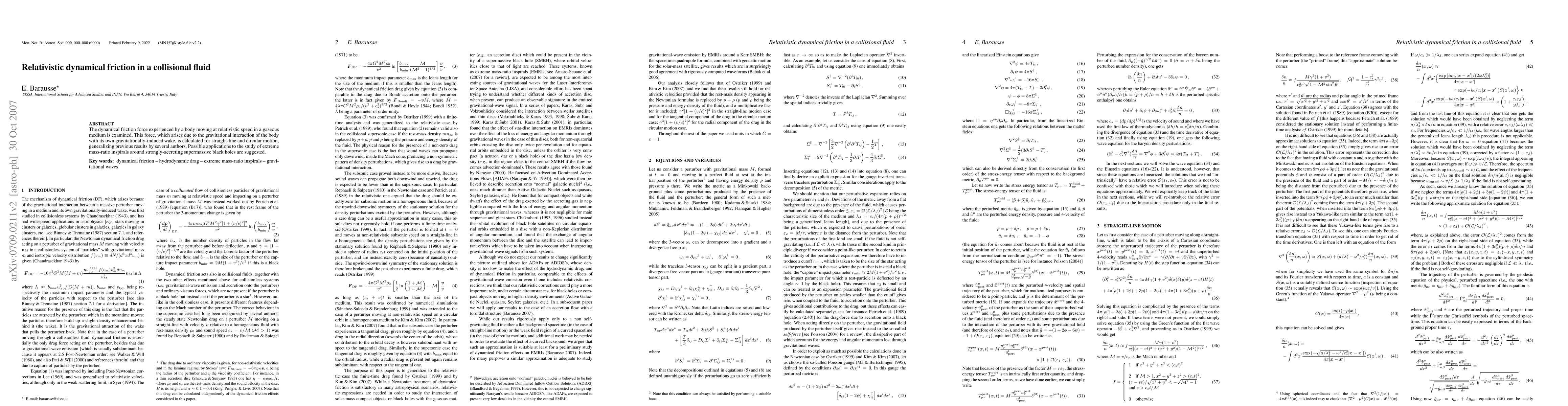 This paper calculates the relativistic dynamical friction force on a body moving through a gaseous medium, generalizing previous results for both straight-line and circular motion, with implications for extreme mass-ratio inspirals around supermassive black holes.