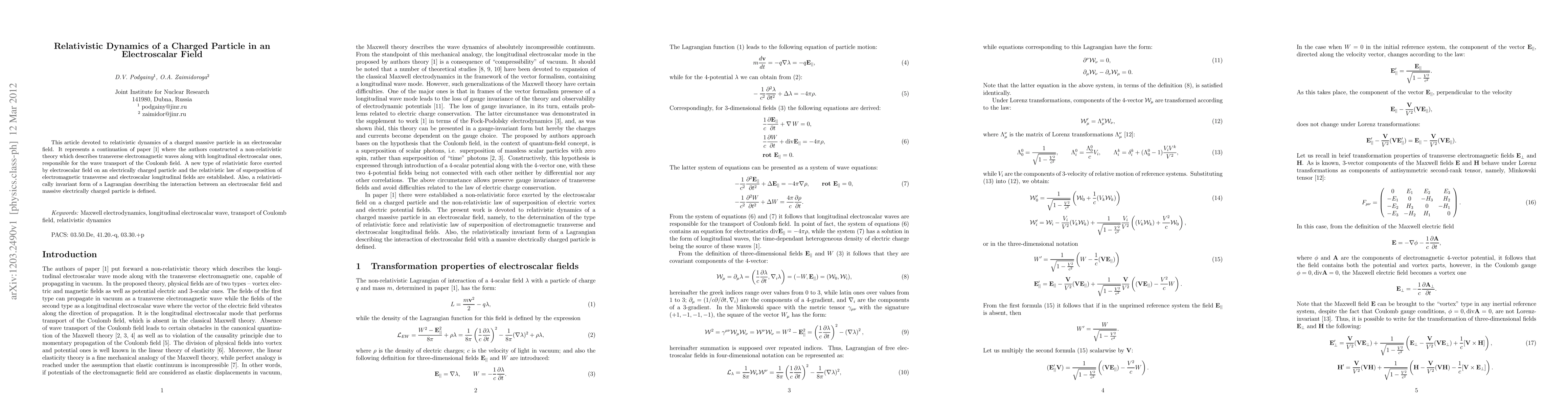 This article devoted to relativistic dynamics of a charged massive particle in an electroscalar field. It represents a continuation of paper [1] where the authors constructed a non-relativistic theory which describes transverse electromagnetic waves along with longitudinal electroscalar ones, responsible for the wave transport of the Coulomb field. A new type of relativistic force exerted by electroscalar field on an electrically charged particle and the relativistic law of superposition of electromagnetic transverse and electroscalar longitudinal fields are established. Also, a relativistically invariant form of a Lagrangian describing the interaction between an electroscalar field and massive electrically charged particle is defined.