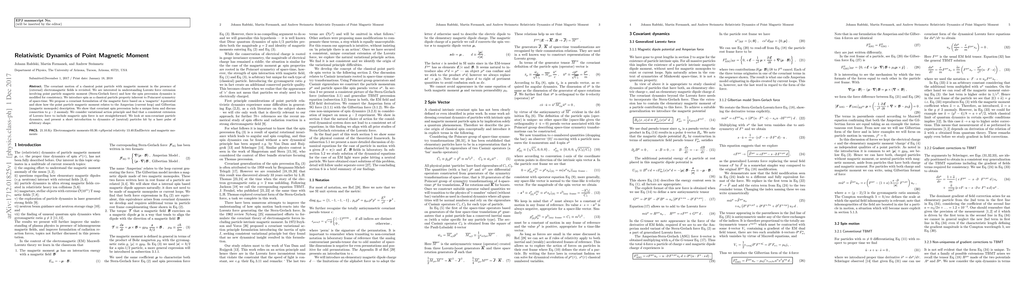 This paper revisits classical point particle dynamics with magnetic moment in electromagnetic fields, proposing a covariant formulation of the magnetic force based on a 4-potential and exploring its implications on spin precession and Lorentz force extension.