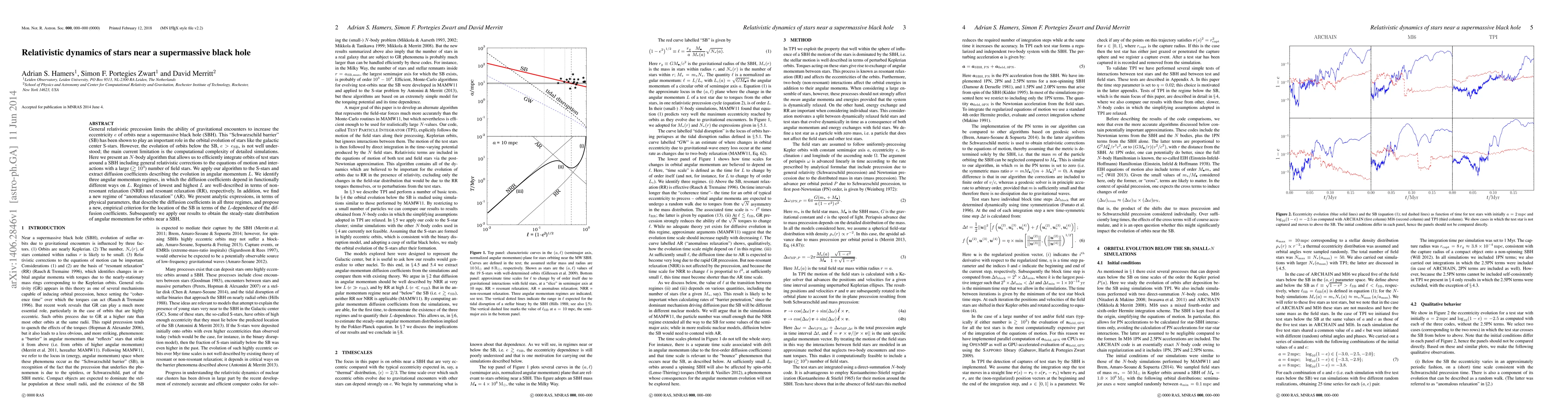 General relativistic precession limits the ability of gravitational encounters to increase the eccentricity $e$ of orbits near a supermassive black hole (SBH). This "Schwarzschild barrier" (SB) has been shown to play an important role in the orbital evolution of stars like the galactic center S-stars. However, the evolution of orbits below the SB, $e>e_\mathrm{SB}$, is not well understood; the main current limitation is the computational complexity of detailed simulations. Here we present an $N$-body algorithm that allows us to efficiently integrate orbits of test stars around a SBH including general relativistic corrections to the equations of motion and interactions with a large ($\gtrsim 10^3$) number of field stars. We apply our algorithm to the S-stars and extract diffusion coefficients describing the evolution in angular momentum $L$. We identify three angular momentum regimes, in which the diffusion coefficients depend in functionally different ways on $L$. Regimes of lowest and highest $L$ are well-described in terms of non-resonant relaxation (NRR) and resonant relaxation (RR), respectively. In addition, we find a new regime of "anomalous relaxation" (AR). We present analytic expressions, in terms of physical parameters, that describe the diffusion coefficients in all three regimes, and propose a new, empirical criterion for the location of the SB in terms of the $L$-dependence of the diffusion coefficients. Subsequently we apply our results to obtain the steady-state distribution of angular momentum for orbits near a SBH.