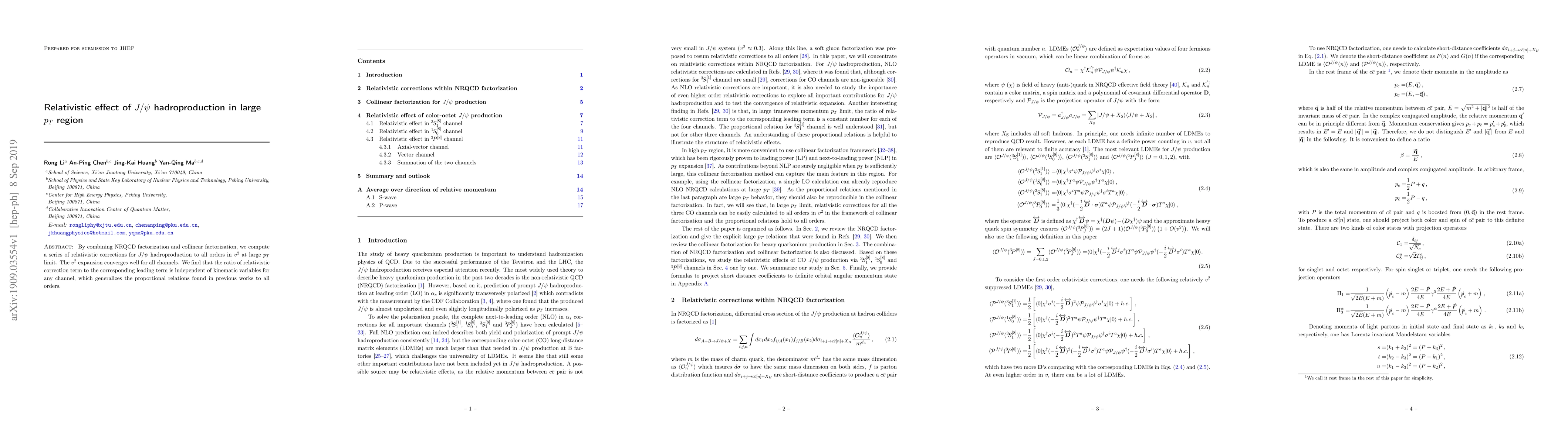 This paper computes relativistic corrections for $J/\psi$ hadroproduction using NRQCD and collinear factorization, finding that the ratio of these corrections to leading terms is independent of kinematic variables, extending previous proportional relations to all orders.