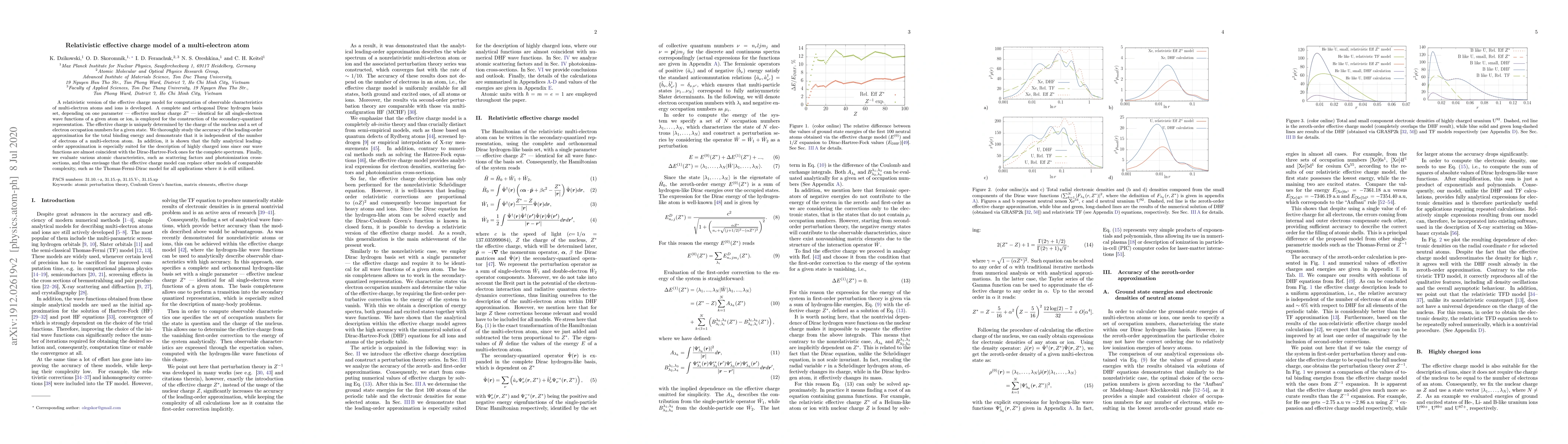 The paper presents a relativistic effective charge model for multi-electron atoms and ions, utilizing a complete and orthogonal Dirac hydrogen basis set. This model accurately predicts atomic characteristics like binding energy, scattering factors, and photoionization cross-sections, independent of the number of electrons. It's particularly effective for highly charged ions, potentially replacing complex models like the Thomas-Fermi-Dirac model in relevant applications.