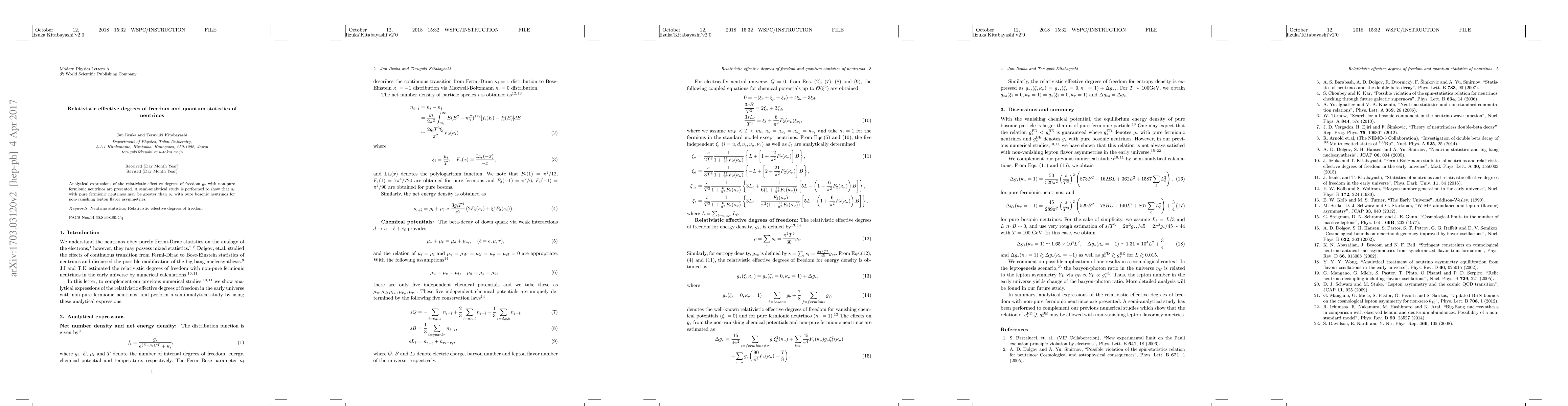 Summary: This paper presents analytical expressions for relativistic effective degrees of freedom $g_\ast$ considering non-pure fermionic neutrinos and demonstrates that $g_\ast$ for pure fermionic neutrinos can exceed that for pure bosonic neutrinos under non-vanishing lepton flavor asymmetries.