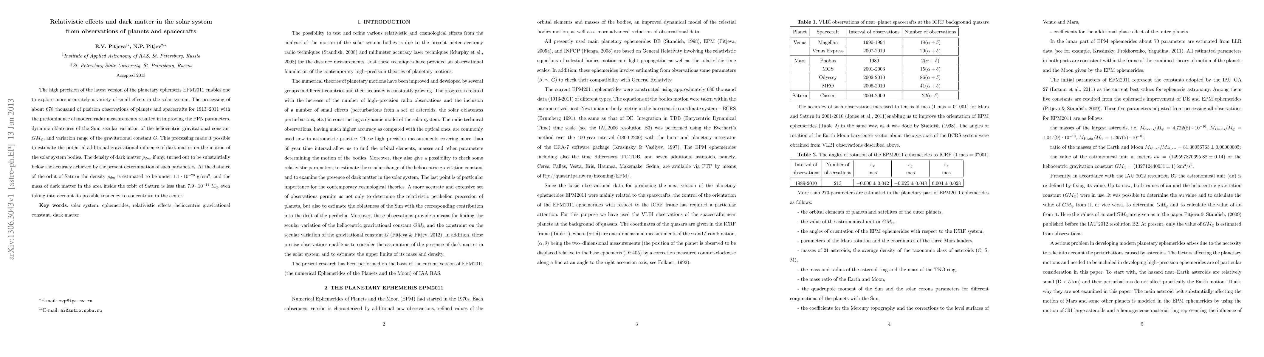 The high precision of the latest version of the planetary ephemeris EPM2011 enables one to explore more accurately a variety of small effects in the solar system. The processing of about 678 thousand of position observations of planets and spacecrafts for 1913--2011 with the predominance of modern radar measurements resulted in improving the PPN parameters, dynamic oblateness of the Sun, secular variation of the heliocentric gravitational constant $GM_{\odot}$, and variation range of the gravitational constant $G$. This processing made it possible to estimate the potential additional gravitational influence of dark matter on the motion of the solar system bodies. The density of dark matter ${\rho}_{dm}$, if any, turned out to be substantially below the accuracy achieved by the present determination of such parameters. At the distance of the orbit of Saturn the density ${\rho}_{dm}$ is estimated to be under $1.1\cdot10^{-20}$ g/cm$^3$, and the mass of dark matter in the area inside the orbit of Saturn is less than $7.9\cdot10^{-11}$ M$_{\odot}$ even taking into account its possible tendency to concentrate in the center.