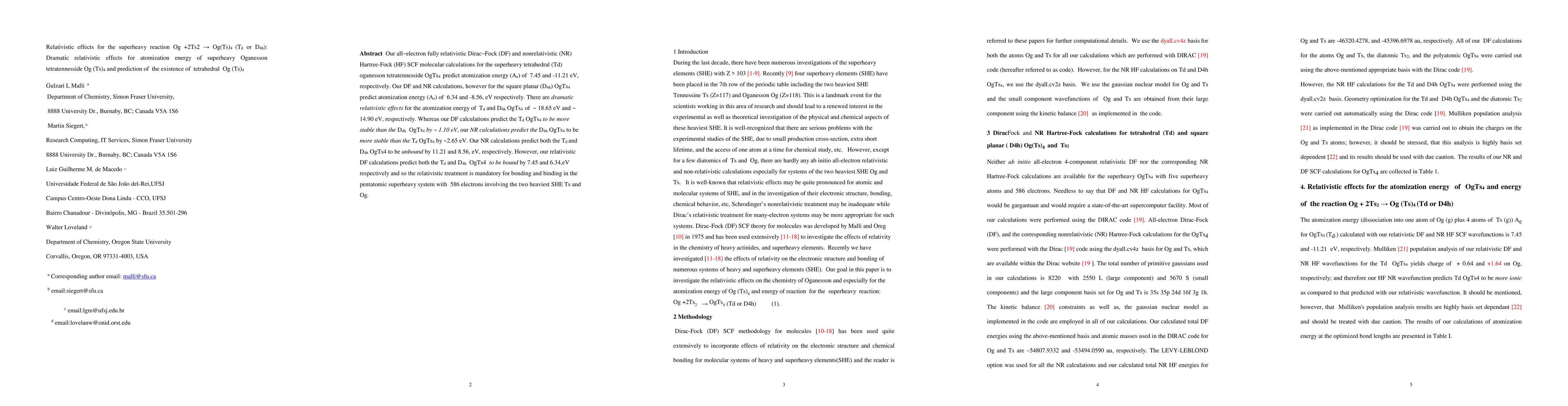 Our all-electron fully relativistic Dirac-Fock (DF) and nonrelativistic (NR) Hartree-Fock (HF) SCF molecular calculations for the superheavy tetrahedral (T$_d$) oganesson tetratennesside OgT$_4$ predict atomization energy (Ae) of 7.45 and -11.21 eV, respectively. Our DF and NR calculations, however for the square planar (D$_{4h}$)OsTs$_4$ predict atomization energy (Ae) o 6.34 and -8.56 ev, respectively. There are dramatic relativistic effects for the atomization energy of T$_d$ and D$_{4h}$ OgT$_4$ of -18.65 eV and 14.90 eV, respectively. Whereas our DF calculations predict the T$_d$OgT$_4$ to be more stable than the D$_{4h}$ OgT$_4$ by ~1.10 eV, our NR calculations predict the D$_{4h}$ OgT$_4$ to be more stable than the T$_d$ OgT$_4$ by ~2.65eV. Our NR calculations predict both the T$_d$ and D$_{4h}$ OgTs$_4$ to be unbound by 11.21 and 8.56 eV, respectively. However our relativistic DF calculations predict both the T$_d$ and D$_{4h}$ OgT$_4$ to be bound by 7.45 and 6.34 eV respectively and so the relativistic treatment is mandatory for bonding and binding in the pentatomic superheavy system with 586 electrons involving the two heaviest SHE Ts and Og.