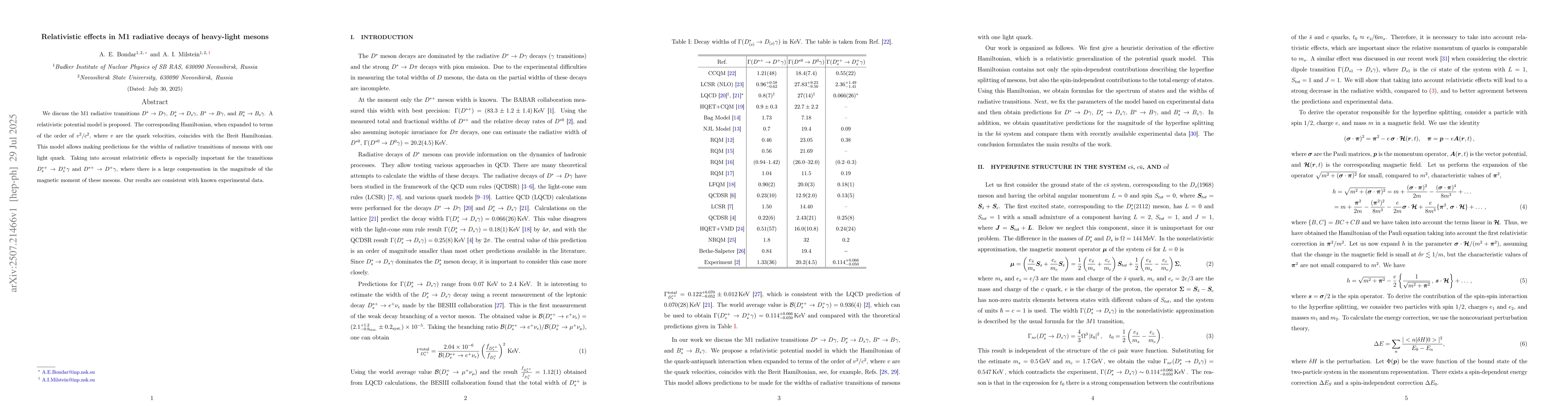 The research proposes a relativistic potential model for M1 radiative transitions of heavy-light mesons, such as D*→Dγ, Ds*→Dsγ, B*→Bγ, and B*s→Bsγ. The model's Hamiltonian, when expanded, aligns with the Breit Hamiltonian, enabling predictions for meson widths with one light quark.