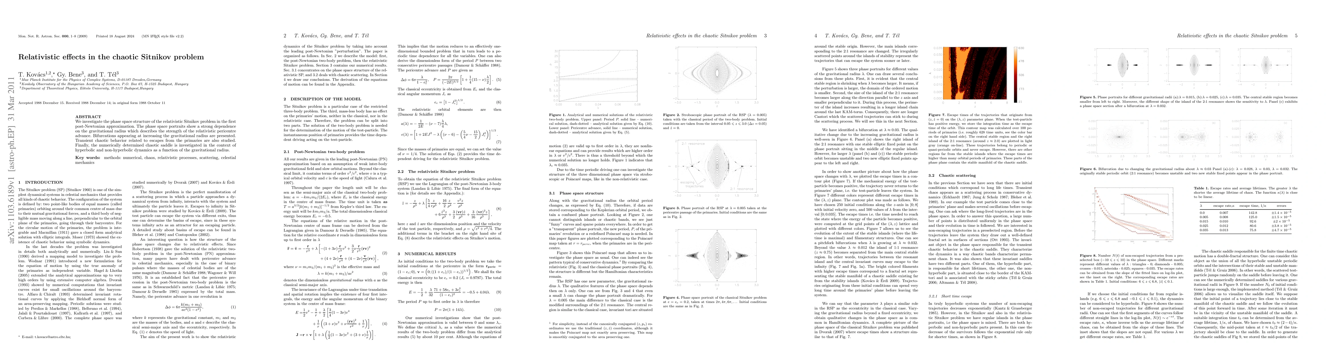 We investigate the phase space structure of the relativistic Sitnikov problem in the first post-Newtonian approximation. The phase space portraits show a strong dependence on the gravitational radius which describes the strength of the relativistic pericentre advance. Bifurcations appearing at increasing the gravitational radius are presented. Transient chaotic behavior related to escapes from the primaries are also studied. Finally, the numerically determined chaotic saddle is investigated in the context of hyperbolic and non-hyperbolic dynamics as a function of the gravitational radius.