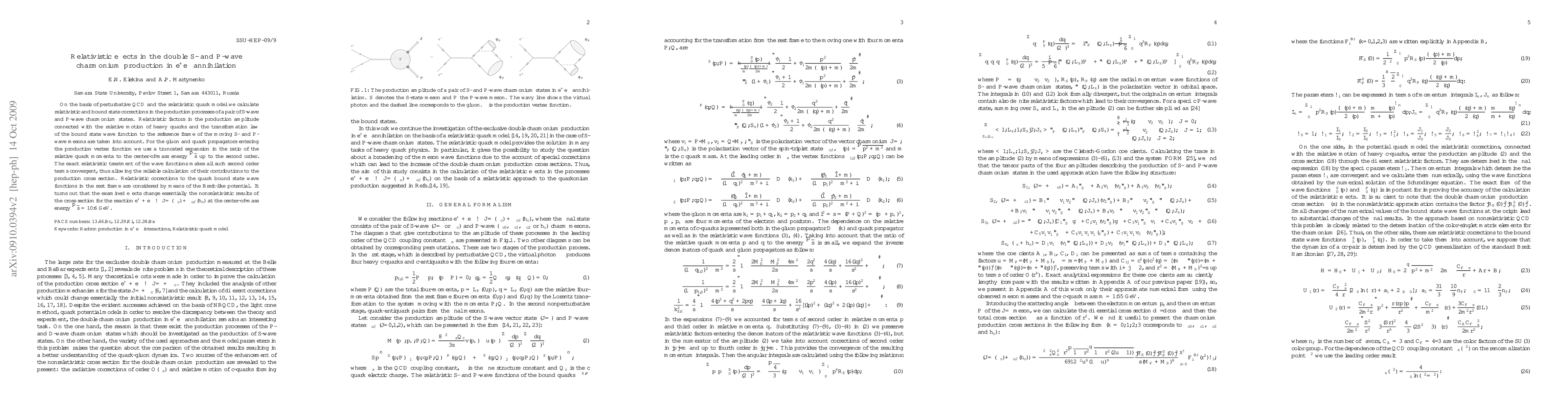 On the basis of perturbative QCD and the relativistic quark model we calculate relativistic and bound state corrections in the production processes of a pair of S-wave and P-wave charmonium states. Relativistic factors in the production amplitude connected with the relative motion of heavy quarks and the transformation law of the bound state wave function to the reference frame of the moving S- and P-wave mesons are taken into account. For the gluon and quark propagators entering the production vertex function we use a truncated expansion in the ratio of the relative quark momenta to the center-of-mass energy $\sqrt{s}$ up to the second order. The exact relativistic treatment of the wave functions makes all such second order terms convergent, thus allowing the reliable calculation of their contributions to the production cross section. Relativistic corrections to the quark bound state wave functions in the rest frame are considered by means of the Breit-like potential. It turns out that the examined effects change essentially the nonrelativistic results of the cross section for the reaction $e^++e^-\to J/\Psi(\eta_c)+\chi_{cJ}(h_c)$ at the center-of-mass energy $\sqrt{s}=10.6$ GeV.