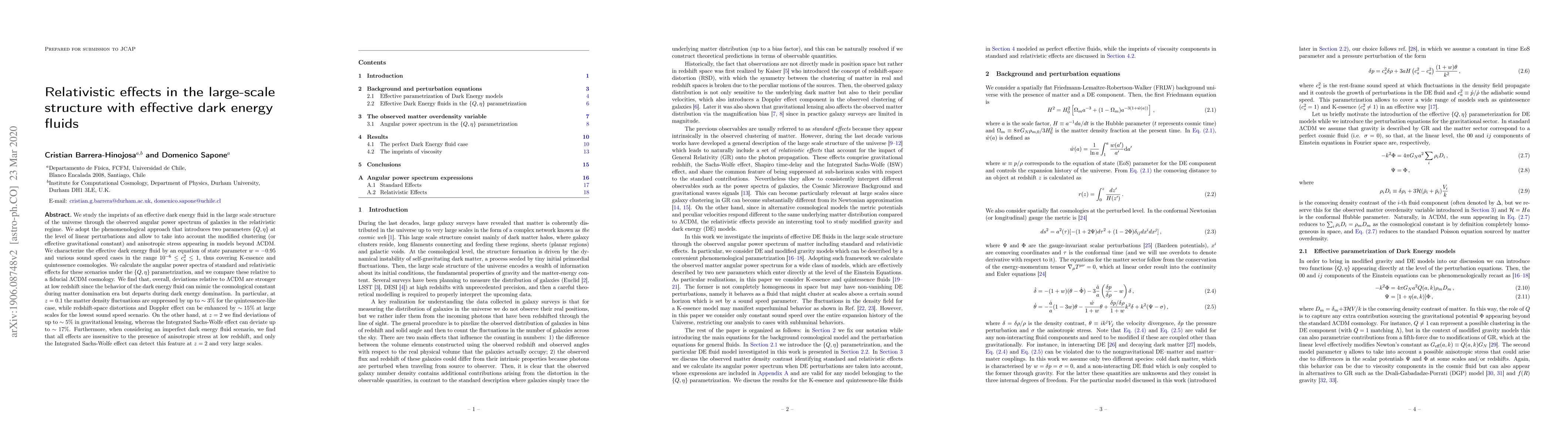 We study the imprints of an effective dark energy fluid in the large scale structure of the universe through the observed angular power spectrum of galaxies in the relativistic regime. We adopt the phenomenological approach that introduces two parameters $\{Q,\eta\}$ at the level of linear perturbations and allow to take into account the modified clustering (or effective gravitational constant) and anisotropic stress appearing in models beyond $\Lambda$CDM. We characterize the effective dark energy fluid by an equation of state parameter $w=-0.95$ and various sound speed cases in the range $10^{-6}\leq c^2_s\leq 1$, thus covering K-essence and quintessence cosmologies. We calculate the angular power spectra of standard and relativistic effects for these scenarios under the $\{Q,\eta\}$ parametrization, and we compare these relative to a fiducial $\Lambda$CDM cosmology. We find that, overall, deviations relative to $\Lambda$CDM are stronger at low redshift since the behavior of the dark energy fluid can mimic the cosmological constant during matter domination era but departs during dark energy domination. In particular, at $z=0.1$ the matter density fluctuations are suppressed by up to $\sim3\%$ for the quintessence-like case, while redshift-space distortions and Doppler effect can be enhanced by $\sim15\%$ at large scales for the lowest sound speed scenario. On the other hand, at $z=2$ we find deviations of up to $\sim5\%$ in gravitational lensing, whereas the Integrated Sachs-Wolfe effect can deviate up to $\sim17\%$. Furthermore, when considering an imperfect dark energy fluid scenario, we find that all effects are insensitive to the presence of anisotropic stress at low redshift, and only the Integrated Sachs-Wolfe effect can detect this feature at $z=2$ and very large scales.