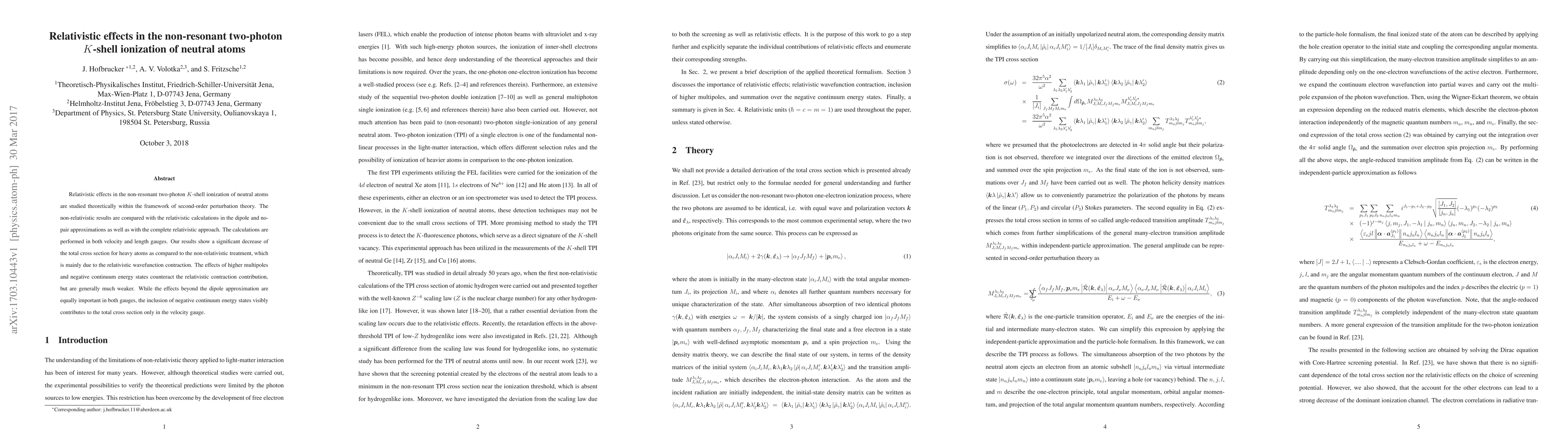 This paper investigates relativistic effects in non-resonant two-photon K-shell ionization of neutral atoms using second-order perturbation theory. It finds a significant reduction in total cross section for heavy atoms due to relativistic wavefunction contraction, with higher multipoles and negative continuum energy states providing minor counteracting effects.