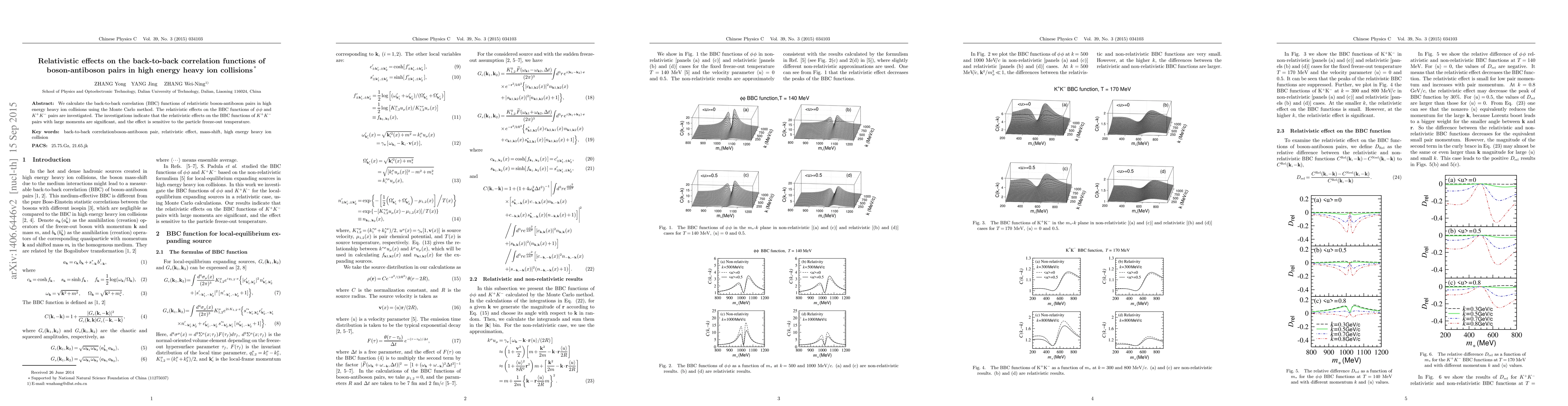 This paper investigates relativistic effects on the back-to-back correlation functions of boson-antiboson pairs in high energy heavy ion collisions using Monte Carlo simulations. It finds significant relativistic effects on $K^+K^-$ pairs with large momenta, which are sensitive to the particle freeze-out temperature.