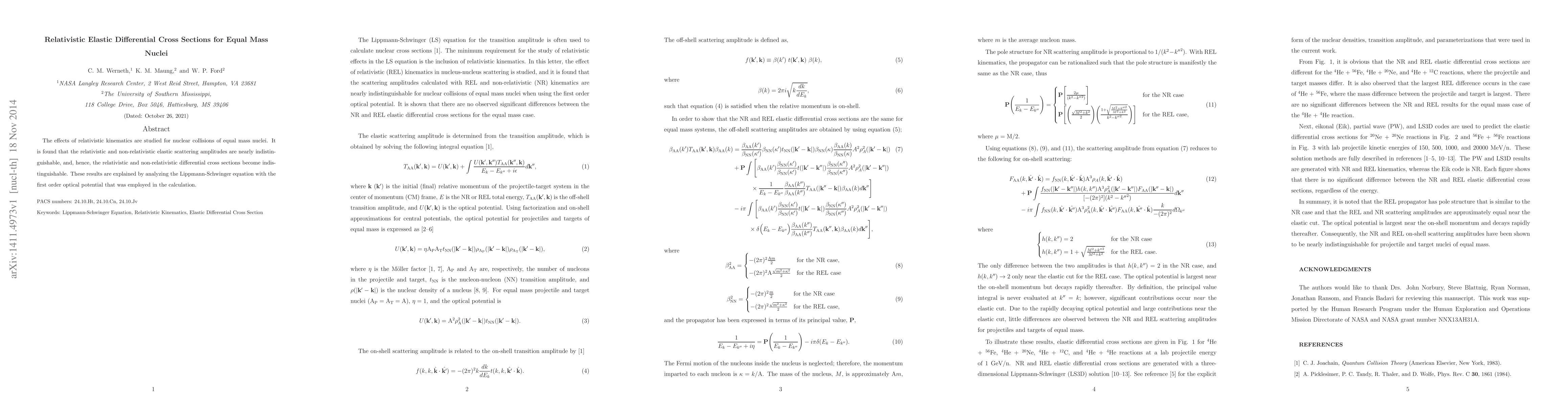 The effects of relativistic kinematics are studied for nuclear collisions of equal mass nuclei. It is found that the relativistic and non-relativistic elastic scattering amplitudes are nearly indistinguishable, and, hence, the relativistic and non-relativistic differential cross sections become indistinguishable. These results are explained by analyzing the Lippmann-Schwinger equation with the first order optical potential that was employed in the calculation