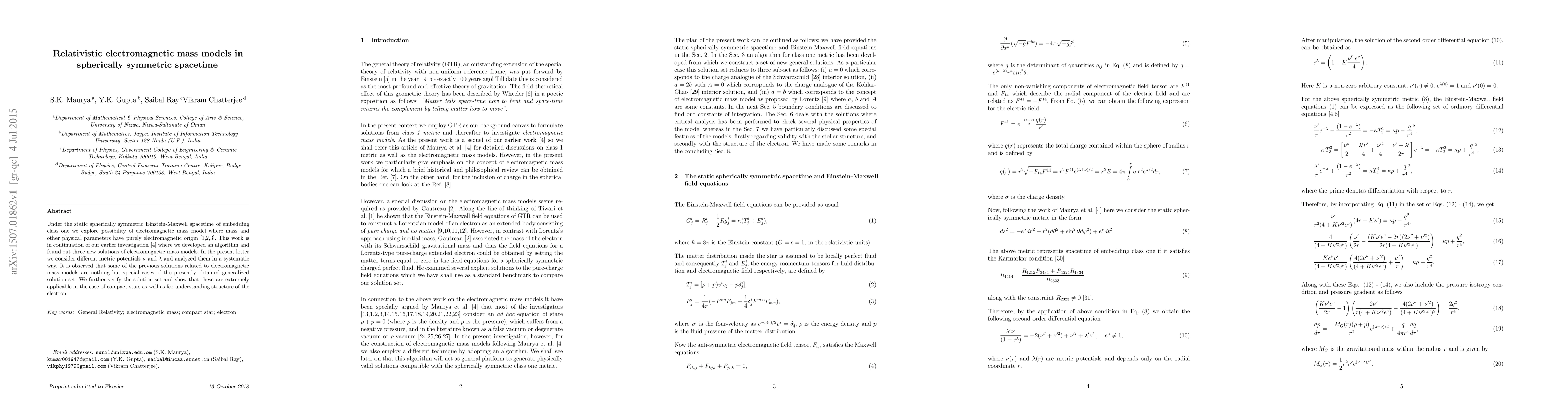 This paper explores electromagnetic mass models in static spherically symmetric spacetime, extending previous work to develop a generalized solution set applicable to both compact stars and the electron's structure. The study verifies these solutions, showing they encompass earlier special cases.