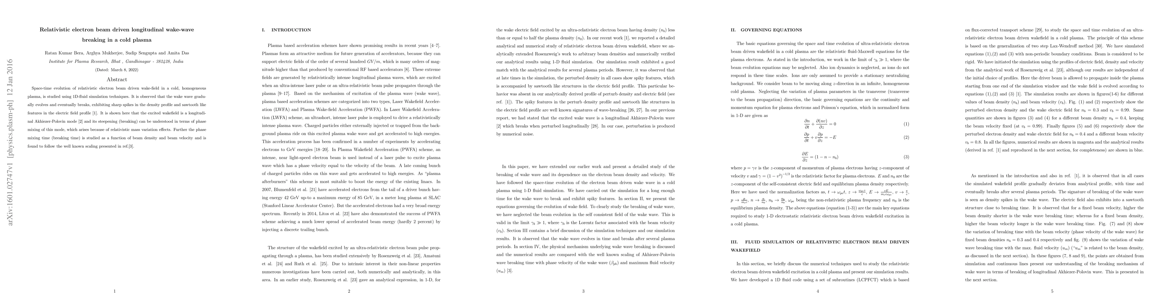 Space-time evolution of relativistic electron beam driven wake-field in a cold, homogeneous plasma, is studied using 1D-fluid simulation techniques. It is observed that the wake wave gradu- ally evolves and eventually breaks, exhibiting sharp spikes in the density profile and sawtooth like features in the electric field profile [1]. It is shown here that the excited wakefield is a longitudi- nal Akhiezer-Polovin mode [2] and its steepening (breaking) can be understood in terms of phase mixing of this mode, which arises because of relativistic mass variation effects. Further the phase mixing time (breaking time) is studied as a function of beam density and beam velocity and is found to follow the well known scaling presented in ref.[3].